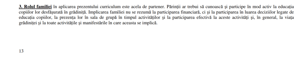 Zilele acestea, din nu știu exact care motive, am deschis din nou Curriculum-ul pentru învățământul preșcolar. Am mai făcut asta acum vreun an și am simțit cum mi se întoarce stomacul pe dos de furie și frustrare. Nu l-am dus la capăt. N-am putut să citesc peste 100 de pagini doar că să am motive să fiu tristă. Pentru că, pe hârtie, acest curriculum pare și el desprins din povești cu zâne. Azi mi-a atras atenția pasajul de mai jos. Mă gândesc cu tristețe la cât de mare e diferența între ce scrie aici și felul cum consideră atât de mulți educatori – și din privat, nu doar din grădinițele de stat – că părinții perturbă buna desfășurare a cursurilor și că nu se pot înțelege cu copiii în prezența părintelui, motiv pentru care acesta din urmă trebuie să dispară cât mai repede din peisaj. Că există cu adevărat și părinți care fac asta, nu contest. Dar cu toți cei care sunt ok ce se întâmplă?