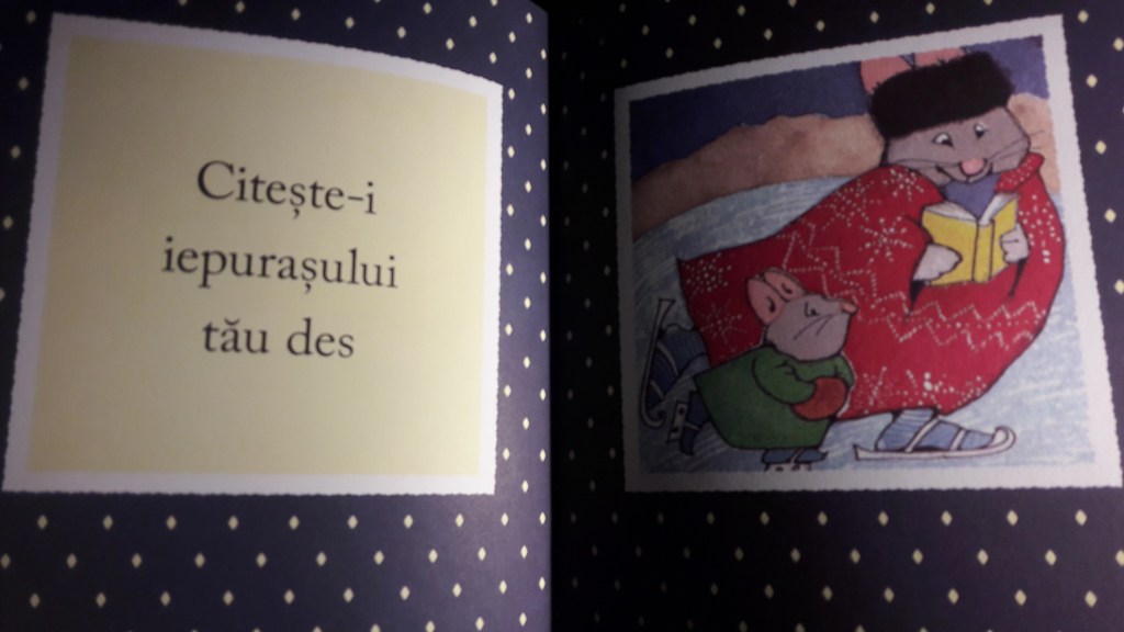 Spre surprinderea mea, deși arăta ca o carte pentru copii, cărticica se adresa, în primul rând, părinților. Titlul ei este Citește-i Iepurașului tău și este, de fapt, o carte despre importanța, frumusețea și beneficiile cititului, încă din clipa în care copilul apare pe lume. Ea cuprinde și multe ilustrații foarte frumoase în care ni se arată cum putem citi în cele mai neobișnuite locuri. Cu această ocazie, dar și pentru că povestea era, totuși, un pic cam scurtă pentru copiii mei, mi-a venit o idee grozavă. Le-am propus copiilor să facem și noi tot ce am văzut în acea carte. Adică, să citim în toate acele locuri. Probabil o să ne ia câțiva ani, având în vedere că cel puțin un loc de acolo reprezintă o adevărată provocare pentru mine. Nu știu să patinez și chiar dacă, poate, voi evolua, sunt sigură că nu voi reuși să patinez în timp ce citesc o carte. Am stabilit însă că, după ce învață ei să patineze bine de tot și să și citească, vor ține ei cartea și tot ei vor citi, în timp ce eu mă voi concentra strict pe menținerea echilibrului pe gheață. Au fost foarte încântați. Cred că o să iasă ceva drăguț.