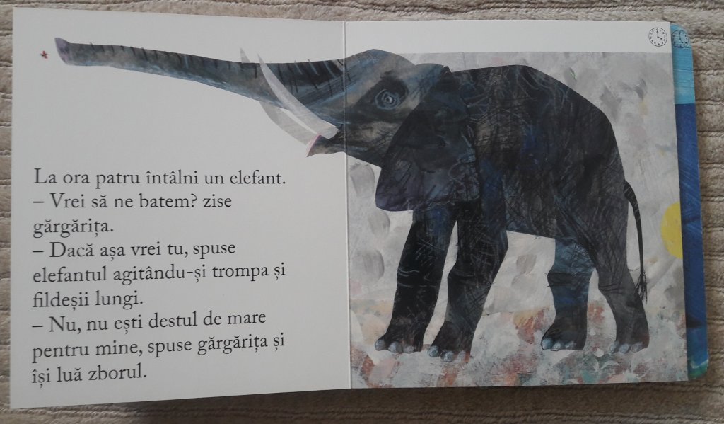 - Gărgărița morocănoasă ( Eric Carle, Editura Cartea Copiilor) este, la rândul ei, o carte deosebită. Pe mine nu m-a atras foarte tare tehnica în care este ilustrată cartea, dar pentru copii e ca un magnet. Plus că Eric Carle are un talent aparte în a transmite mesaje prețioase copiilor. Cartea este despre o gărgăriță morocănoasă care se întâlnește cu o gărgăriță prietenoasă și pentru că nu dorește să împartă mâncarea și să fie, la rândul ei, drăguță, pleacă în căutare de adversari cu care să se bată. Pare însă că nu găsește pe nimeni suficient de mare pentru ea… până când găsește și învață o lecție prețioasă. Cartea este cartonată cu totul, părând a fi pentru copii foarte mici. Tudor, la cinci ani, încă o citește cu drag. De fapt, îi sunt atât de dragi cărțile lui Eric Carle că, de câteva ori, l-am surprins citindu-i surioarei lui – el știe povestea pe dinafară.