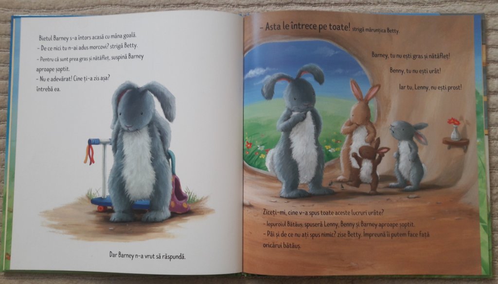 - Cine se teme de Iepuroiul cel Rău? ( Steve Smallman, Caroline Pedler; Editura Cartemma) este utilă, în primul rând, pentru copiii care sunt necăjiți de alți copii și prezintă felul cum patru frați iepurași micuți pot să îi reziste unui iepure mare și bătăuș, dacă sunt uniți și au încredere în ei. Am scris aici despre cum una dintre cele mai bune metode de aplanare a conflictelor între frați este să le dăm oportunitatea să formeze o echipă. În plus, această carte poate să îi ajute să își dea seama cât de mare este impactul vorbelor și al faptelor urâte și cum mereu există și alternative.