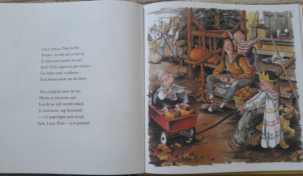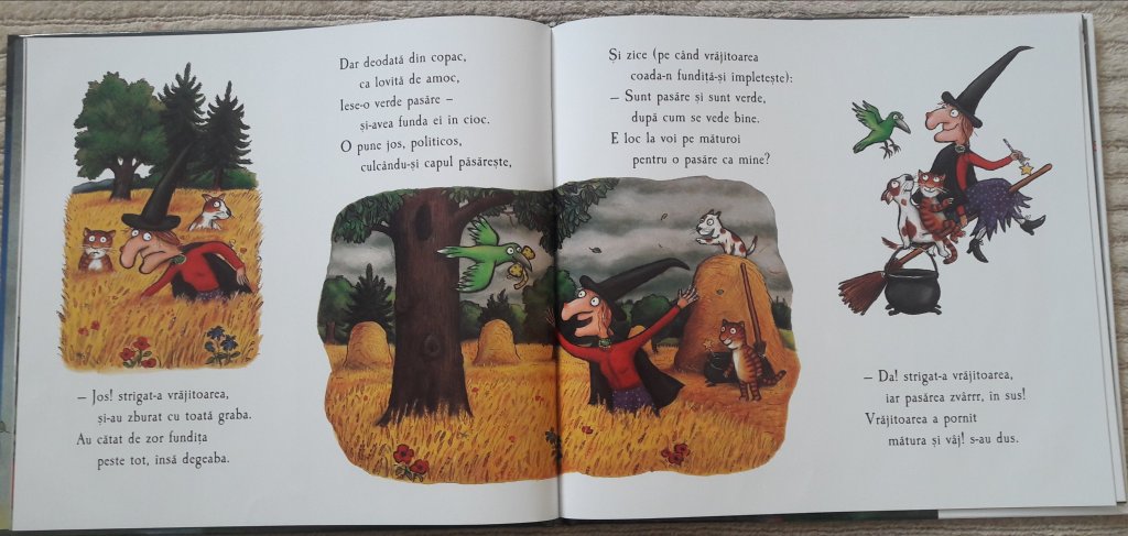 - Loc la voi pe măturoi (Julia Donaldson, Axel Scheffler; Editura Cartea Copiilor) este o poveste în versuri, amuzantă și foarte bine gustată de copii, pentru care se găsește și o scută animație pe youtube, aici. În acest caz, animația îmi pare că oferă și ceva în plus față de carte și o văd foarte utilă. Pe scurt, este vorba despre o vrăjitoare (bună, desigur) care zboară liniștită pe un măturoi, împreună cu pisica ei. După câteva întâmplări amuzante se ajunge în situația în care mai multe animăluțe sunt primite de vrăjitoare pe măturoi și, în consecință, măturoiul se rupe. La final, descoperim într-o manieră încântătoare și originală atât că unde-s mulți și uniți puterea crește, când cele patru animăluțe mici reușesc să o salveze pe vrăjitoare de un dragon mare și puternic, dar și cum, până la urmă, se găsește loc pentru fiecare și toată lumea e mulțumită. Deși cartea e deosebit de frumoasă, există o diferență notabilă între ea și animație, care mă face să vă recomand să vedeți neapărat și filmulețul, dacă, desigur, nu sunteți 100% împotriva ecranelor. Diferența este că în filmuleț pisica este vizibil deranjată de faptul că vrăjitoarea primește atât de multe animale pe măturoi, în timp ce în carte nu se observă nimic în acest sens.