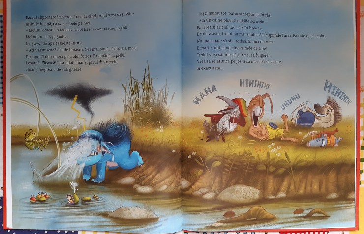 Reacția copiilor mei a fost minunată. Amândoi s-au bucurat tare încă din clipa în care au văzut coperta, pentru că le era drag trolul. Am constatat apoi că deși băiețelul a fost atras de prima carte mai tare decât fetița de 3 ani, cea de-a doua poveste a impresionat-o mai tare pe ea. Atât de tare încât a început să aplice cu succes tehnicile de acolo, nu doar pentru ea, ci și pentru ceilalți. Nu cred că voi uita vreodată momentul acela în care m-am supărat pe frățiorul ei, iar ea a venit la mine și m-a rugat să respir adânc, să număr și să-mi trimit furia în tei. N-am avut de ales. N-are cum să nu-ți treacă furia, atunci când te învață un copil de trei ani cum să o controlezi.