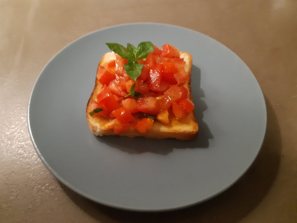 Bruschetele cu roșii nu sunt preferatele copiilor mei pentru că ei nu mănâncă usturoi. Eu le ador cu usturoi, dar pentru cei mici pot fi făcute și fără. Modul de preparare este, din nou, foarte simplu. Aveți nevoie de roșii și busuioc proaspăt, ulei de măsline, sare și câteva felii de pâine. Roșiile și busuiocul se taie mărunt și se amestecă cu sarea și uleiul de măsline. Dacă este posibil, e bine să le lăsați să se odihnească împreună câteva minute. Între timp se prăjesc feliile de pâine și apoi, cât sunt încă fierbinți/ calde, se freacă cu câte un cățel de usturoi. Aceasta din urmă poate fi o activitate destul de interesantă pentru copii care sunt fascinați de felul în care se topește usturoiul la contactul cu pâinea caldă.
