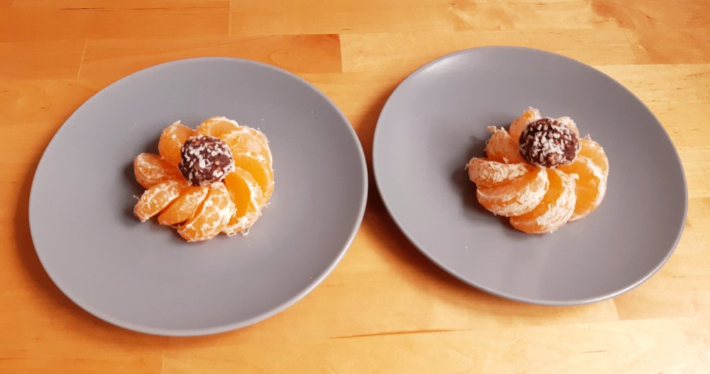 În cazul de față, eu am folosit 250 ml.lapte, 150 gr. unt, 2 linguri cacao, 2 linguri zahăr brun, 350 gr.biscuiți simpli, 50 gr.fulgi de ovăz, 50 gr. nuci. Untul, laptele, cacaoa și zaharul se amestecă împreună la foc mic, până când untul se topește, iar celelalte ingrediente se mărunțesc împreună. La final se amestecă toate și copiii pot modela bomboane cu mânuțele. Bomboanele se servesc neapărat alături de fructe proaspete.