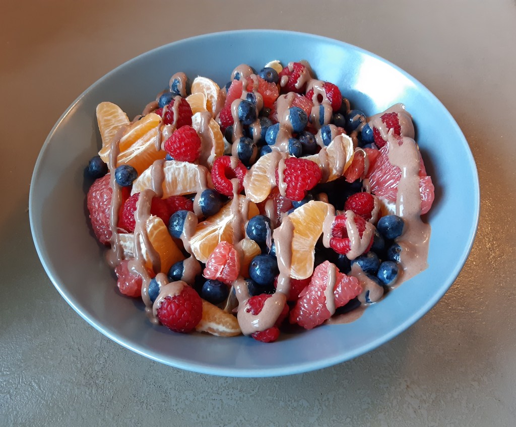 Aici, iarăși, e simplu. Pe scurt, alegeți ce fructe doriți, le amestecați, pur și simplu, și, opțional, le stropiți cu puțin sos de ciocolată. Pentru prepararea sosului eu folosesc cam 100 ml de smântână neîndulcită, pentru frișcă, și 70 de grame de ciocolată neagră. Acestea se topesc împreună la foc foarte mic sau la bain marie și gata sosul.