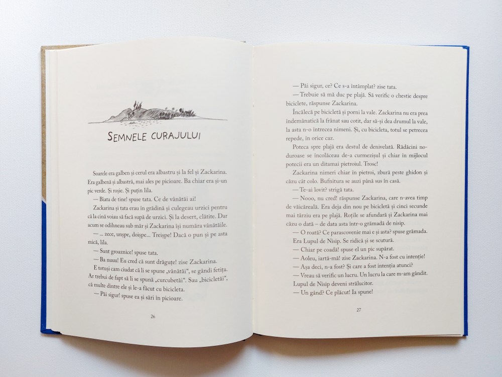 În ceea ce privește vârsta la care poate fi citită, cred că depinde mult de copil, deoarece aceasta este o carte cu foarte puține ilustrații și doar alb-negru. Cei mai mici, obișnuiți cu multe poze vor fi, poate, reticenți la început, dar asta nu-i o problemă. O vor citi/asculta atunci când vor fi pregătiți pentru ea. În orice caz, eu le-aș prezenta-o ca fiind o carte care oferă răspunsuri la cele mai importante întrebări. Pentru că fix asta e. Lupul de Nisip, neobișnuitul prieten al Zackarinei, fetița din carte, se prezintă a fi cel care știe absolut tot. Și nu cred că minte deloc. Apoi, le-aș spune câte ceva și despre cât de interesant și deosebit e acest personaj, dar și despre cum fetița din carte seamănă mult cu ei.