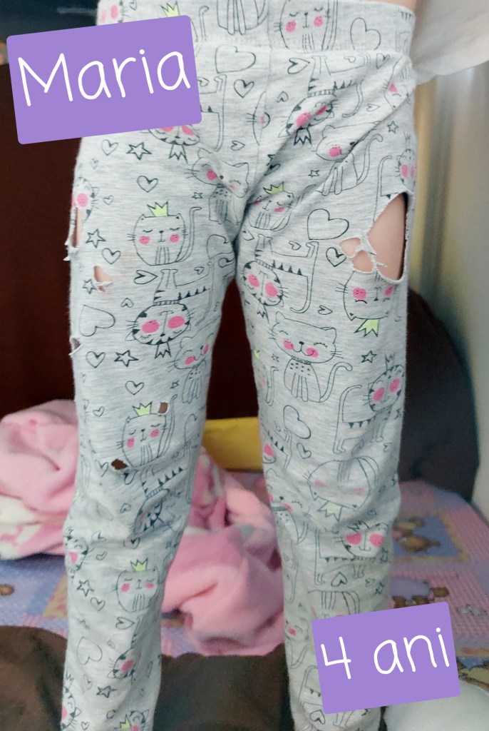 Apoi, cred că cei mici ar trebui lăsați să zburde cu imaginația în orice loc vor ei, dacă acest lucru e posibil. Da, dacă Maria ar fi avut o singură pereche de pantaloni, n-ar fi fost în regulă să-i taie. Dar nu are doar o singură pereche și e în regulă să fie așa. Mai ales că, după această experiență, și-a înțeles singură lecția, fără să o cert eu. Pentru că îi erau dragi pantalonii și, deși i s-a părut interesant să-i taie și i s-a părut interesant și ce a ieșit, și-ar fi dorit să fie din nou întregi. Îi plăceau mai mult înainte, dar n-avem cum să îi readucem la starea inițială.