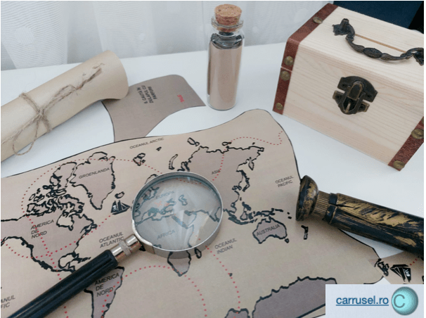 Pe lângă toate acestea, putem duce vânătoarea de comori și la ult nivel, iar harta poate fi harta locuinței, sau a curții. Posibilitățile sunt nelimitate. Din nou, ea poate fi realizată de la zero, acasă, nefiind necesar ca părintele să aibă vreun talent special, ci doar o bună orientare în spațiu, mult entuziasm și mult imaginație. Pentru părinții are nu au timp, dar își doresc să organizeze o astfel de vânătoare de comori, am adăugat și opțiunea de vânătoare de comori personalizată. Aceasta are și avantajul de a îi învața pe copii despre spațiul în care trăiesc, despre cum să se orienteze în acest spațiu sau despre cum sunt create hărțile. În același timp le oferă și acel ceva special pe care doar lucrurile personalizate – unice – îl pot oferi și le stimulează imaginația.