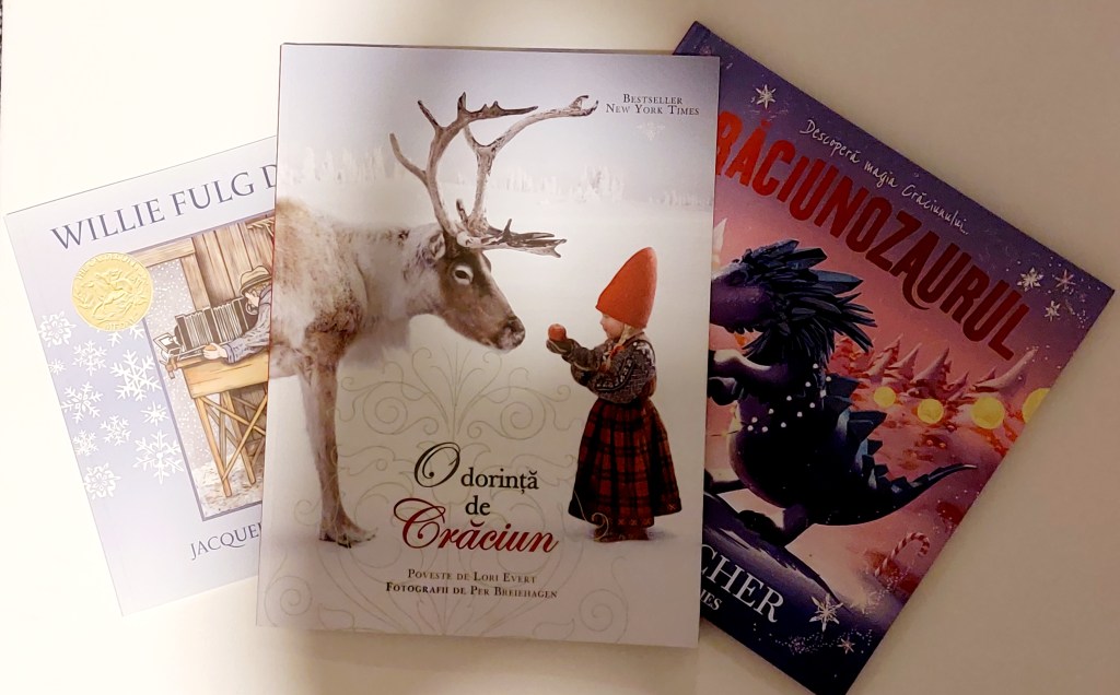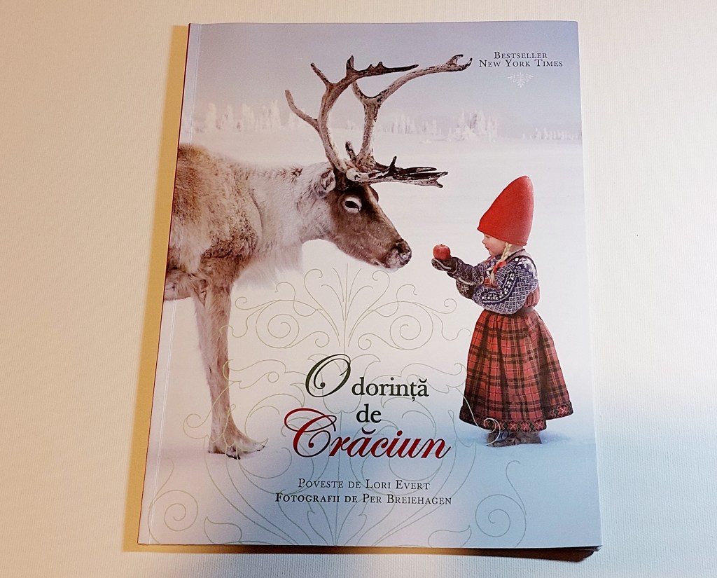 Ultima carte din acest articol se numește O dorință de Crăciun și în ea găsim din toate, adică inclusiv pe Moș Crăciun, dar și ceva cu totul și cu totul deosebit. Povestea e clasică, cu mesaj frumos, dar ceea ce scoate cartea în evidență sunt fotografiile. Da, ați citit bine, am scris fotografiile. Această carte cuprinde fotografii adevărate cu un copil adevărat și, da, sunt superbe. Realizate de un fotograf care a lucrat, printre altele, pentru National Geographic, aceste fotografii sunt pur și simplu magice, iar copiii sunt foarte impresionați atunci când văd un copil adevărat cum călărește un urs sau cum mângâie un ren; atât de impresionați încât le privesc cu răsuflarea tăiată. Scrisă de Lori Evert, cu fotografii dePer Breiehagen și fetița lor, Anja în rolul personajului principal, cartea a apărut la Editura Curtea Veche în 2017 . Este potrivită, din punctul meu de vedere, pentru oameni mici și oameni mari, indiferent de vârstă.
