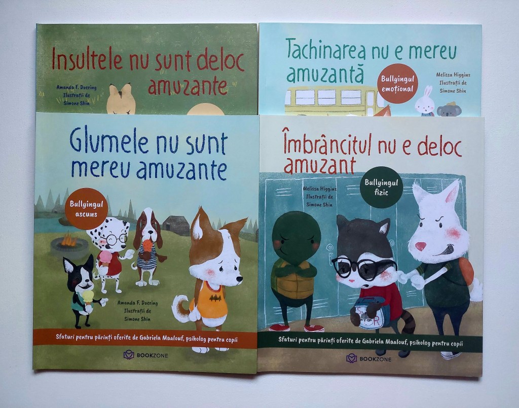 Prin urmare, vă recomand cinci cărți pentru copii. Primele 4 au apărut la Editura Bookzone și prezintă, pe înțelesul copiilor, probleme cum sunt insultele, tachinarea, glumele (proaste) și îmbrâncitul – sau, pe scurt, bullying. Noi le avem de ceva timp, copiii au fost foarte interesați de ele și multe discuții interesante au pornit de aici. Mie îmi plac și pentru că ilustrațiile sunt destul de sugestive, dar și pentru că mi se pare că descriu foarte bine stările prin care trece un copil atunci când se fac glume pe seama lui, este tachinat sau agresat în alte feluri. Cred că, de cele mai multe ori, copiii fac rău altor copii pentru că nu își dau seama ce impact au faptele lor asupra celorlalți. Tachinarea, de exemplu, se poate întâmpla și între frați care se iubesc foarte tare și, oficial, nu și-ar face rău unul altuia. Cărțile astea invită la a privi și din perspectiva celui agresat și acesta mi se pare cel mai mare plus al lor.