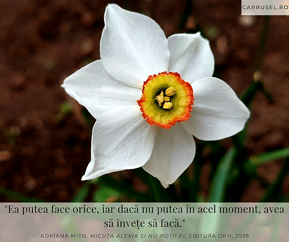Azi e vorba despre „Nu pot!” și despre cum aceste două cuvinte chiar ne pot împiedica să actionăm inclusiv în acele situații în care am putea. De fapt, mulți psihologi, între care și dr.Edith Eger pe care o apreciez foarte mult, susțin că întotdeauna putem și întotdeauna avem de ales. M-am bucurat, citind asta, să constat că o idee asemănătoare am regăsit-o mai demult, într-o carte pentru copii. Cred că e foarte util ca cei mici să învețe despre puterea cuvintelor și a gândurilor bune, mai ales că, din punctul meu de vedere, acest „Nu pot!” nu e ceva cu care ne naștem, ci e ceva ce învățăm. Cei mai mulți copii se nasc curajoși și cu o dorința uriașă de a cunoaște lumea în profunzime și de a experimenta. Ei sunt si foarte determinați și rareori îi oprește vreun obstacol. E suficient să urmărim un copil care învață să meargă și să vedem cum, deși cade de nenumărate ori, continuă să se ridice. Totuși, noi îi impiedicăm adesea (uneori pe bună dreptate, pentru a îi proteja de pericole reale) să facă lucruri și le spunem sau le dăm de înțeles că nu pot face un lucru sau altul. Spunându-i copilului „nu poți!” îl învățăm să spună, la rândul lui, „Nu pot!” și acest „Nu pot” se poate dovedi a fi destul de greu de înlăturat ulterior. Ar fi mai bine să-i explicăm copilului de ce nu îl lăsăm să facă anumite lucruri și să insistăm asupra faptului că în timp va învață să facă tot ce își dorește.