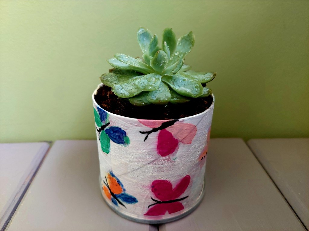 De asemenea, ne mai plac mult plantele suculente pentru că și ele sunt ușor de îngrijit, dar și pentru că se pot face tot felul de aranjamente cu ele. Eu m-am bucurat de ele în special în perioada în care nu puteam avea grijă de alte plante și le-am ales și pentru copii atunci când au dorit o plantă pe care să o îngrijească singuri în interior. Ghivecele pentru ele le facem tot noi, acasă. Mai jos e noua plăntuță a Mariei.