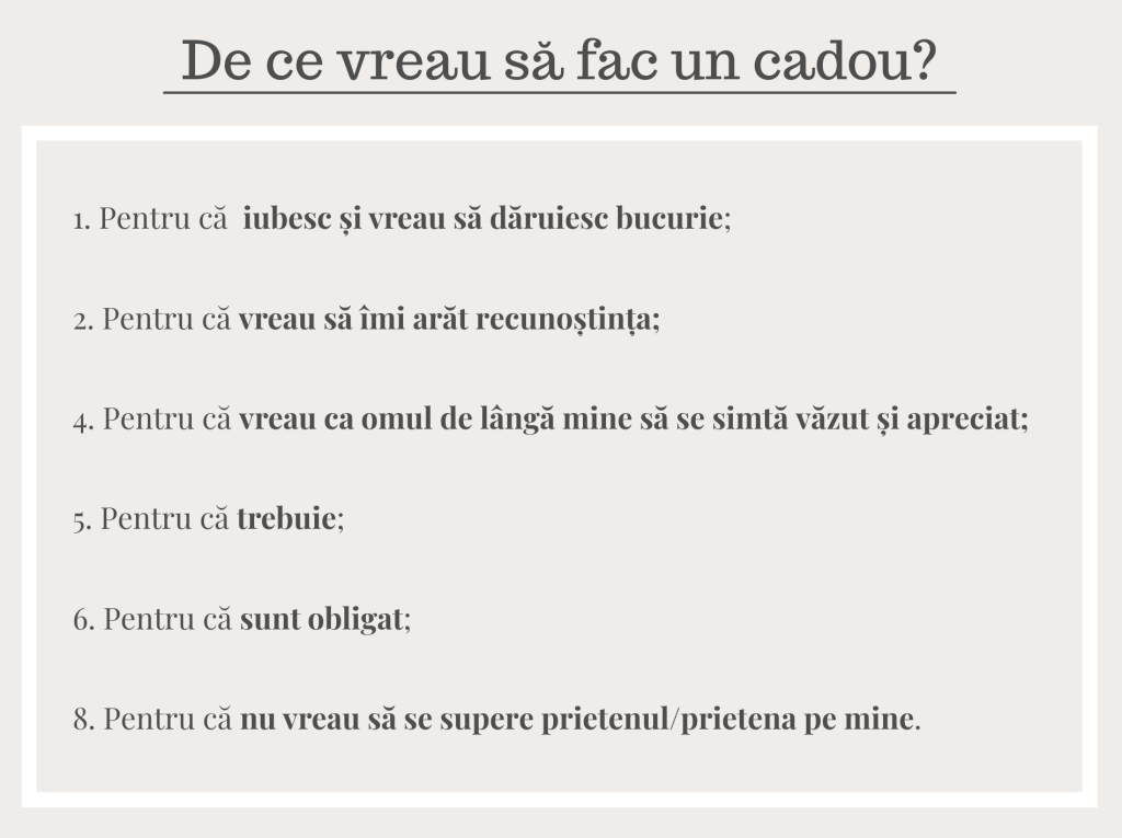 Parafrazându-l pe Gary Chapman, eu aș spune că Țelul unui cadou nu e să ne ajute să obținem ceva de la celălalt sau să îndeplinim o simplă formalitate, ci să facem ceva pentru binele și bucuria celui căruia i-l oferim. Pornind de la această idee, cred că primul lucru pe care ar trebui să îl facem înainte de a cumpăra un cadou ar fi să ne întrebăm „de ce?” și, în funcție de răspuns, să acționăm.