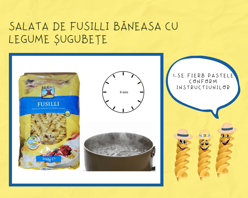 Se pune apa la fiert cu puțină sare și, atunci când începe să clocotească, se adaugă Fusilli grâu dur Băneasa și se fierb conform instrucțiunilor, în acest caz, timp de 8 minute. Atunci când sunt gata, se răstoarnă într-o sită, se țin puțin sub jet de apă rece, pentru a se răci mai repede, se scurge apa și, apoi, se pun într-un castron și se amestecă cu o lingură sau două de ulei de măsline. Uleiul de măsline are rolul de a face salată mai cremoasă, pentru a rezista mai bine și în frigider. Dacă mai rămâne ceva, desigur.