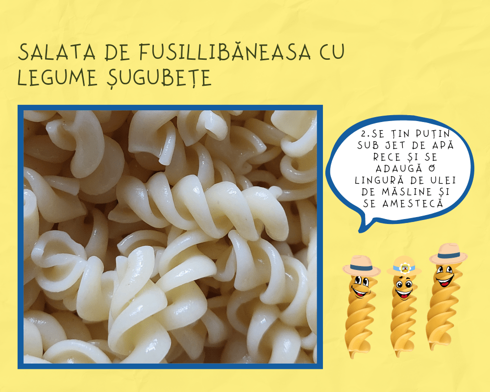În ceea ce mă privește, am vrut mereu să le ofer amintiri frumoase copiilor mei și să-i împrietenesc cu mâncarea. Cred că aceasta nu e doar pentru a umple burtici goale și mai cred că pegătirea și servirea mesei pot fi momente de conectare și relaxare, de timp frumos petrecut împreună. De asta aleg să vă prezint azi una dintre variantele noastre de salată de paste. Inspirată de copilul din mine care, în suflet, încă-l are pe bunicul alături, și de copiii mei care, atunci când pregătim această salată, îmi amintesc de mine, când găteam cu bunicul, am făcut-o cât mai veselă și numai bună de gătit alături de cei mici. Și le-am spus și lor povestea pastelor, așa cum sunt ele azi. Să știe și copiii din zilele noastre că pasta pe care-o au în farfurie a fost, întâi si-ntâi, un bob de grâu și-apoi a străbătut un drum lung și frumos până să ajungă la noi. Desigur, am și o surpriză. Rețeta se găsește la finalul articolului în format pdf downloadabil și cuprinde și o mică poveste și trei fișe de lucru draguțe. Dar, înainte de a ajunge acolo, vă invit să-i descoperiți aici pe Fussi, Șurubica și Fusișor, povestea lor și rețeta noastră de salată.