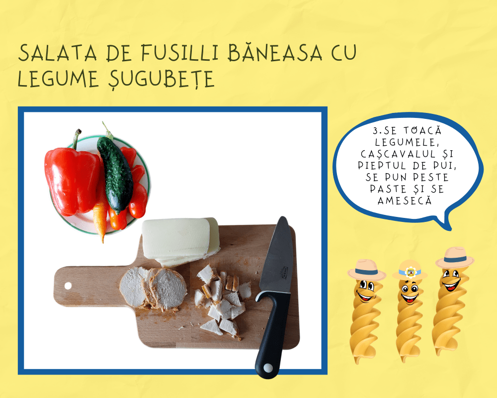 Când toate legumele au fost tocate, tăiem și pieptul de pui și cașcavalul în cuburi și le punem pe toate peste fusilli, adăugăm sare după gust și amestecăm.