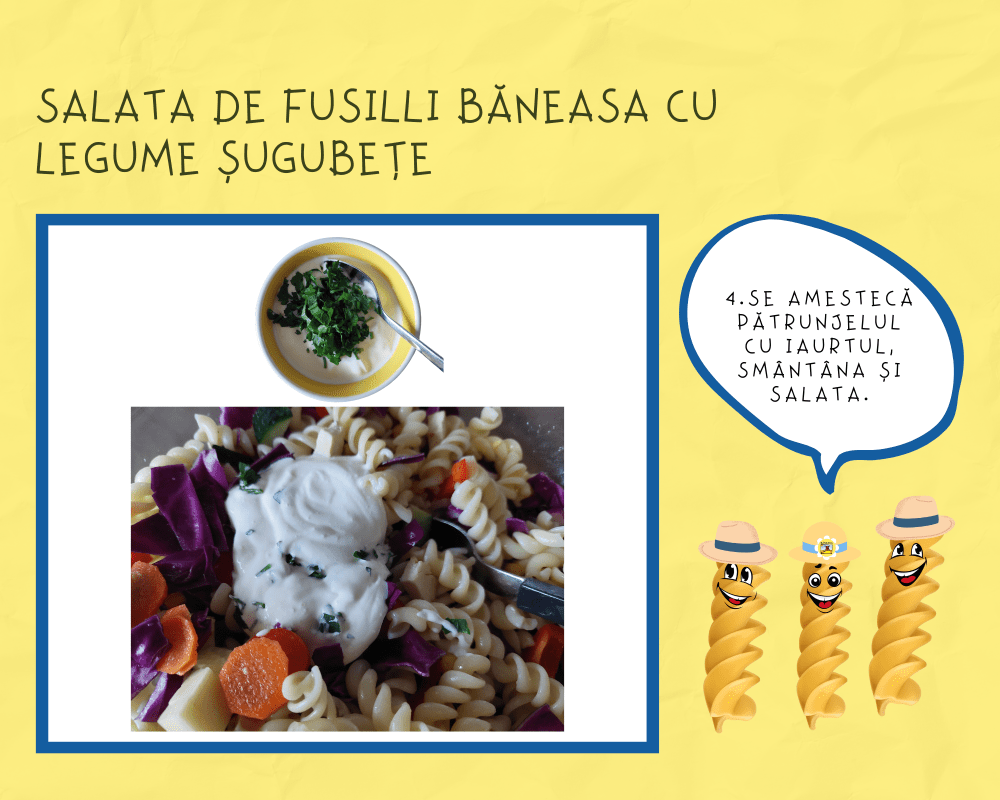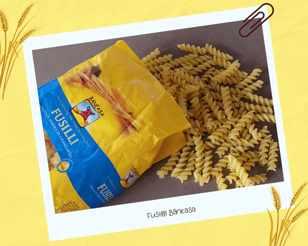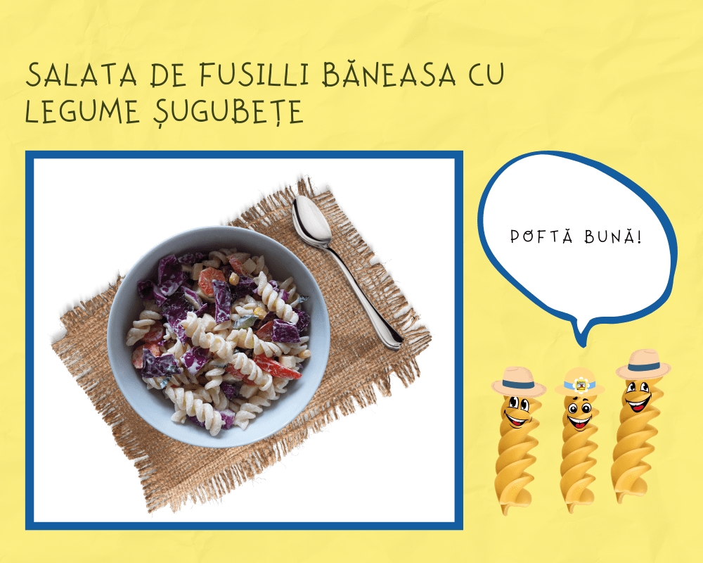 Ah! Era să uit. Povestea asta s-ar putea să vă ajute și dacă aveți copii mai mofturoși. De exemplu, la noi în familie, eu și Maria, fetița mea, iubim pastele în mod deosebit, soțul meu le mănâncă fără să aibă vreo reacție wow, iar Tudor, băiețelul mai mare, le refuză. Când făceam salata de mai sus, masa lui era reprezentată de toate celelalte ingrediente pe care le mânca în timp ce o pregăteam. Acum mi-a venit ideea de a ne juca cu ele în felul acesta. Și, ce credeți? Băiețelul a fost tare încântat. Atât de încantat, încât ieri a mâncat salata cu totul și a decretat că Fusilli Băneasa sunt preferatele lui dintre paste și va mai mânca. Până atunci, doarme cu Fussi, Șurubica și Fusișor lângă pat. 🙂