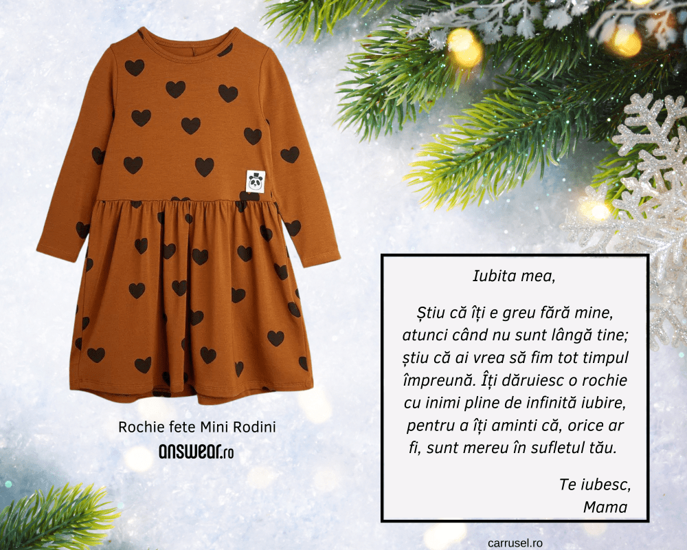 Hmm… Stați puțin. Am spus că e Crăciunul, eu sunt copil și-mi doresc o rochie? De ce si-ar dori o fetiță de 7 ani să primească drept cadou o rochie? Sau, mai bine, spus, de ce și-ar dori un copil să primească haine cu ocazia Crăciunului? Copiii nu-și doresc haine, nu? Sau da?… Mai bine vă povestesc mai jos ce cred eu despre asta.