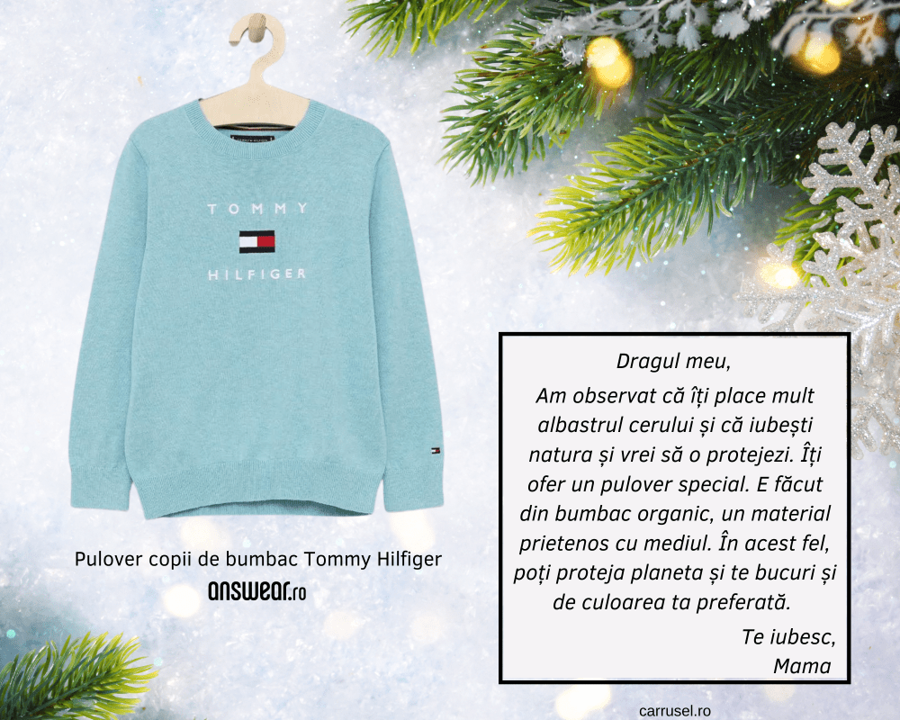 Atunci când eram copil, primeam mereu haine, la toate ocaziile. Urmau dulciurile, în timp ce jucăriile erau pe locul trei sau nu erau deloc. Apreciam aceste cadouri. Mereu m-am bucurat sincer, cu acea bucurie care doar în ochii unui copil se poate vedea, dar, recunosc, mi-aș fi dorit să primesc și altceva sau aș fi renunțat, cu toată inima, le ghetele noi, pentru o jucărie. Chiar dacă știam că de ghete am nevoie. Acestea fiind spuse, v-ați putea gândi că, în condițiile astea, nu prea visam la haine sau încălțăminte. Și totuși, în mod aproape surprinzător, erau și ele în visurile mele. Desigur, niciodată nu le-am primit. Nu așa cum doream și vorbesc aici despre hainele de sărbătoare; despre rochițele roșii sau despre hainele cu Moș Crăciun, cu reni, cu oameni de zăpadă, cu globuri colorate și câte și mai câte alte minunății de Crăciun. Atât de tare îmi doream să port și eu astfel de haine, cum nici nu pot descrie în cuvinte. Dar ele nu doar că ar fi fost inaccesibile, financiar vorbind, nici măcar nu existau în magazinele din micul orășel lângă care locuiam. Și am rămas doar cu visurile frumoase, visuri care, în mod neașteptat, s-au transformat în realitate cu ajutorul copiilor mei. Și nu pot exprima în cuvinte nici bucuria din ochii lor atunci când primesc haine cu tematică de sărbători. Tudor, care multă vreme n-a acceptat nici cel mai mic desen pe haine, a făcut mereu o excepție de Crăciun. Pentru că îi era tare drag așa cum, în general, celor mai mulți copii le e drag să se costumeze. E o joacă frumoasă în care poate fi implicată toată familia și prin intermediul căreia putem duce mesajele frumoase la un nivel și mai înalt. Mă gândesc, spre exemplu, la minunatul United Colors of Benetton Pulover copii rosu pe care-l vedeți în poza de mai jos. Eu încerc mereu să-i implic pe copii și în procesul de a dărui, nu doar celor dragi, ci și celor pe care nu-i cunoaștem si care nu au nici măcar o parte mică din tot ce avem noi. Cred că un astfel de pulover ar fi o răsplată binemeritată și o recunoaștere a eforturilor lor și sunt sigură că l-ar purta cu drag, cu mândrie și cu dorința de a face și mai mult bine.
