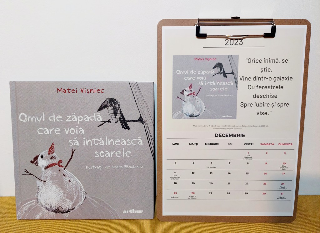 Sper din suflet ca fiecare copil la care ajunge acest calendar să se bucure din toată inima de el și, desigur, citatele alese să trezească în el curiozitatea de a citi sau reciti cartea. De asemenea, le sunt recunoscătoare scriitorilor români care m-au inspirat: Ana Dragomir, Cristina Donovici, Alec Blenche, Ioana Chicet-Macoveiciuc, Alex Donovici, Florin Bican, Simona Epure, Cristina Andone, Iulia Iordan, Victoria Pătrașcu, Ileana și Maria Surducan și Matei Vișniec.