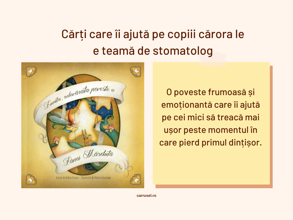 De asemenea, pentru copiii cărora li se mișcă dințișorii, există, la Editura Cartemma, Lunița, adevărata poveste a Zânei Maseluță. Momentan nu e în stoc, dar cred că poate fi găsită la bibliotecă. E foarte frumoasă și pe noi ne-a ajutat mult.