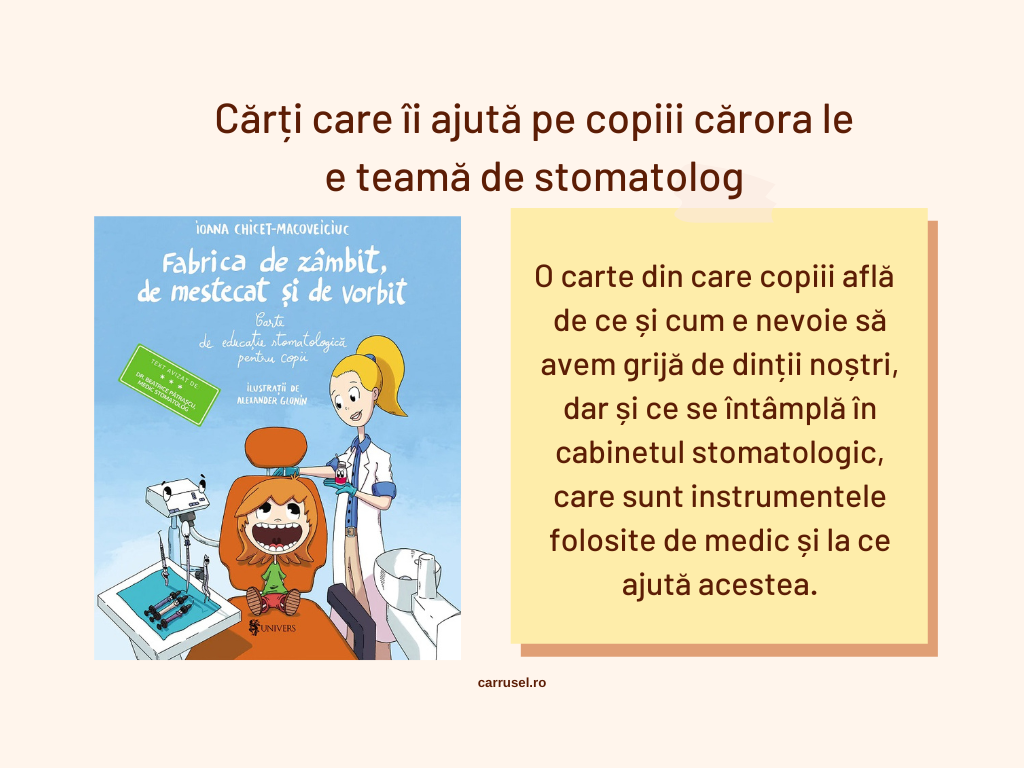Sunt multe astfel de cărți. Dacă ar fi să recomand câteva, aș începe cu ultima carte a Ioanei Chicet Macoveiviuc, inaccesibilă nouă pe vremea aceea, dar pe care o consider foarte utilă. Cartea se numește Fabrica de zâmbit, de mestecat și de vorbit și prezintă cabinetul și procedurile stomatologice pe înțelesul copiilor. A apărut la Editura Univers în 2022.