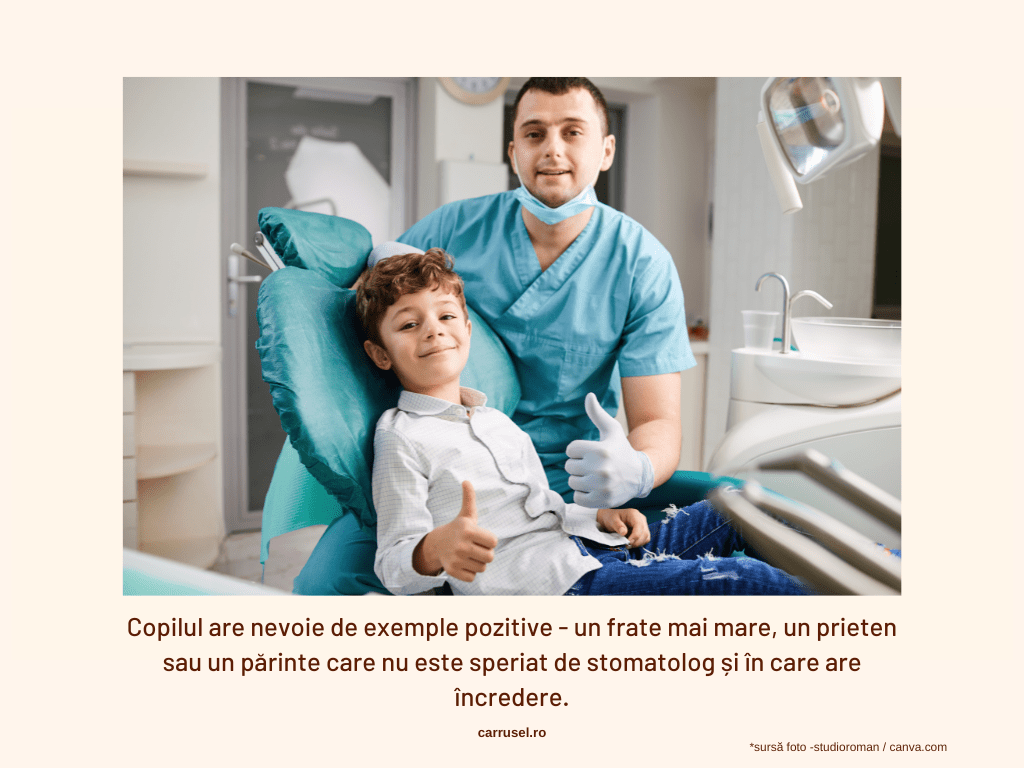 Desigur, nu toți copiii au un frate mai mare și uneori chiar fratele mai mare e cel care nu vrea la stomatolog. În acest caz, ar fi bine dacă am putea găsi un prieten care să le ofere un exemplu pozitiv. În cazul în care nici acest lucru nu e posibil, putem insista mai mult pe modelul pe care îl oferim noi, părinții, unul care oricum nu ar trebui să lipsească. Ideal ar fi ca, dacă e posibil, să mergem la stomatolog pentru o procedura de rutină, cum ar fi un periaj profesional, și să luăm și copilul cu noi, pentru a urmări ce se întâmplă. Important e ca lucrurile să nu fie forțate, medicul să fie de acord și să nu avem asteptări nerealiste de la copil. În același timp, e exclus să îl luăm cu noi dacă avem proceduri mai complicate de făcut – pentru că nu știm cum va reacționa și e posibil să nu-l lase pe medic să-și facă treaba – sau dacă nouă, la rândul nostru, ne e foarte teamă și nu putem gestiona ok această frică.