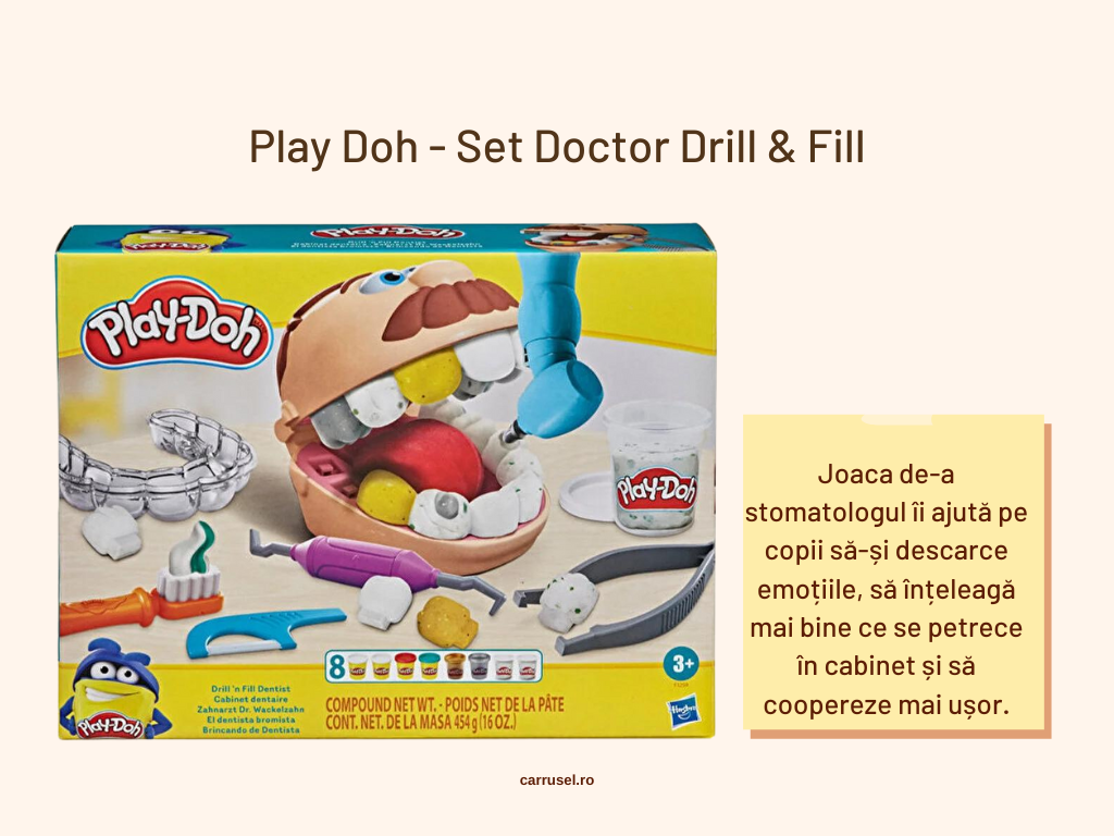 De asemenea, e important și să avem instrumentale medicale de jucărie. Pe vremea aceea am cautat mult o trusă medicală care să aibă și instrumentele folosite de stomatolog și să nu coste o avere. Am găsit-o, dar foarte greu. Poate că azi sunt mai multe opțiuni. Dacă nu, o astfel de trusă și/sau instrumentele care lipsesc, pot fi și confecționate manual, din carton. În plus, ulterior am luat un set PlayDoh (cel din poza de mai jos) care a avut și are un mare succes. Chiar și azi îl folosesc copiii, înainte sau după vizita la stomatolog și nu doar atunci.