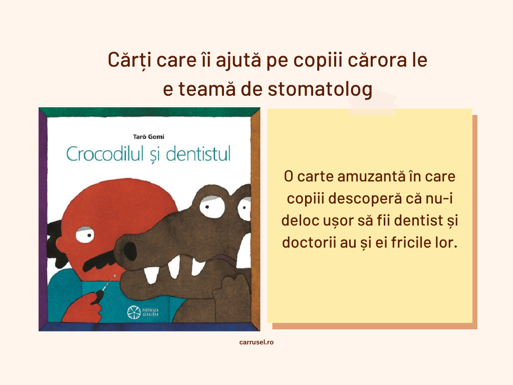 Strict pentru teama de stomatolog, la Editura Portocala Albastră se găsește o cărticică tare amuzantă despre un crocodil care merge la dentist – Crocodilul și dentistul. Dentistul e mai mic și e la fel sau chiar mai speriat decât crocodilul. Mie mi s-au părut tare urâței amândoi, ca să nu spun înfricoșători, dar cred că fix asta face cărticica și mai prețioasă. Copiii s-au distrat foarte tare atunci când am citit-o, iar ăsta e un indicator important al faptului că e o carte bună.