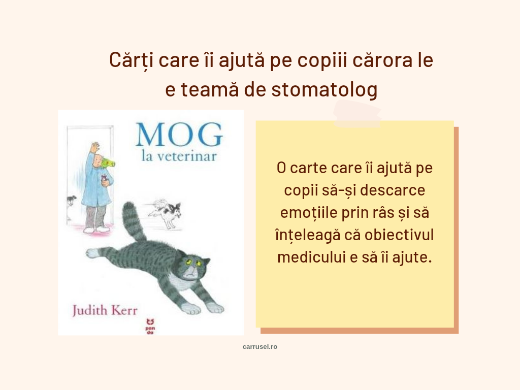 Pe lângă acestea, mai sunt multe, sper să reușesc să fac, la un moment dat, un articol separat. Acum aș mai menționa doar cartea Mog la Veterinar. Aceasta a fost, din punctul meu de vedere, cartea care a avut cel mai mare impact asupra copiilor mei și cea care ne-a ajutat cel mai tare. Nu e despre stomatolog, e despre o pisicuță care merge la veterinar fără voia ei, dar Judith Kerr a reușit să ilustreze perfect emoțiile și nevoile copiilor. Cărticica asta a fost atât de iubită și citită, încât e printre puținele care s-au rupt, deși noi avem mare grijă de cărți.