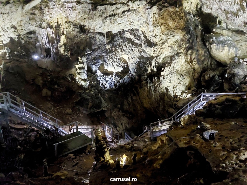 Nu mă pricep la peșteri, așa că n-aș îndrăzni să o descriu. Eu, din postura unui om simplu, apreciez mult liniștea și misterul pe care le oferă o peșteră, dar și măreția naturii care, singură, poate crea așa o minunăție. Vizita nu a durat foarte mult, dar a fost, cu siguranță deosebită. Am văzut și un mic liliac pe care nici nu l-aș fi observat dacă nu ne-ar fi spus ghidul și m-am bucurat să aflu că cei mici știu diferența dintre stalactite și stalagmite. Mai învăț și eu de la ei. 🙂