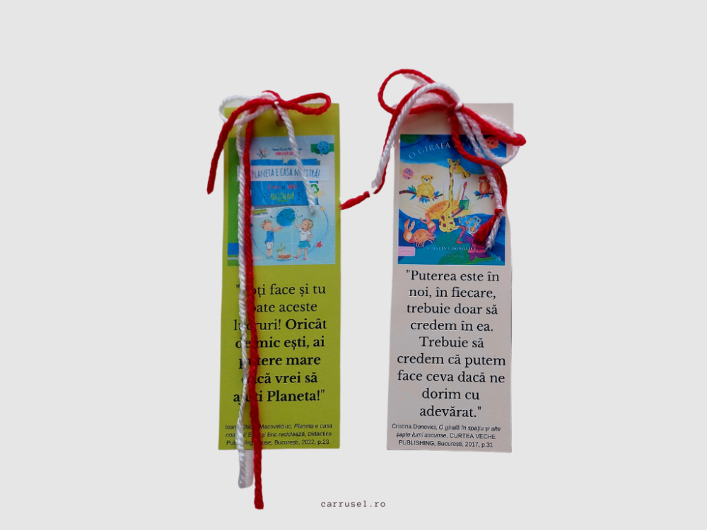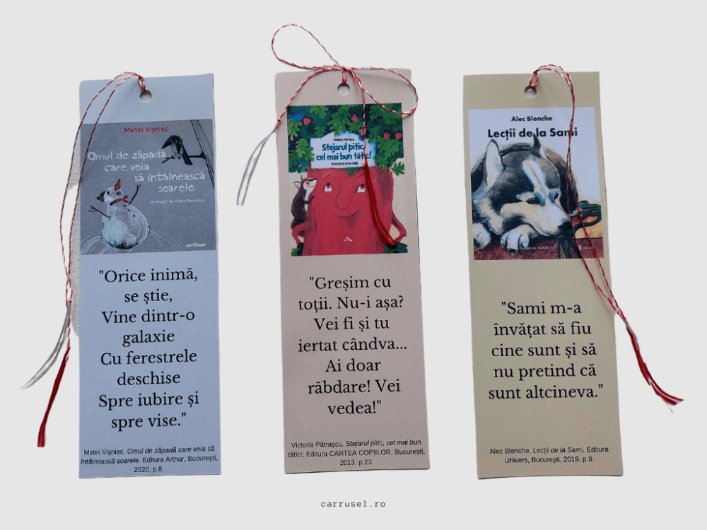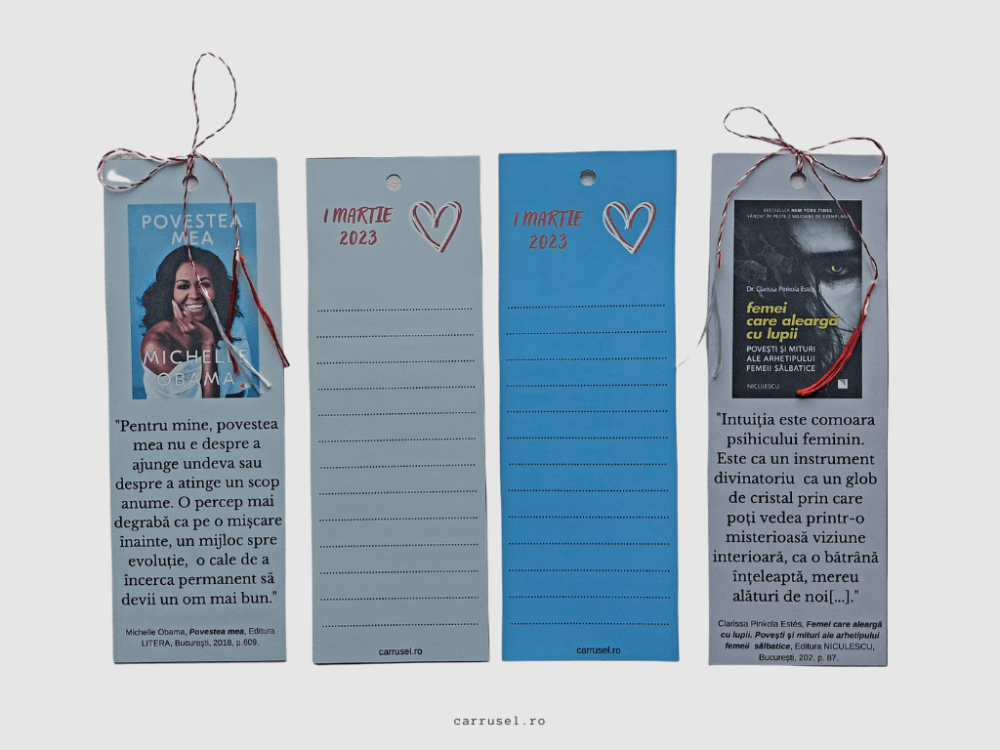 Nu am avut timp să fac foarte multe. Am folosit aproape aceleași cărți pe care le-am inclus și în Calendarul Micului Cititor, cărți frumoase pentru copii scrise de autori români contemporani. Totuși, am făcut și ceva în plus. De data asta m-am gândit și la oamenii mari și am făcut și patru semne de carte cu cărți pentru ei. Sau, mai corect spus, pentru ele, căci am ales cărți care sunt mai degrabă pentru femei, deși nici bărbaților nu le-ar face rău dacă le-ar citi.
