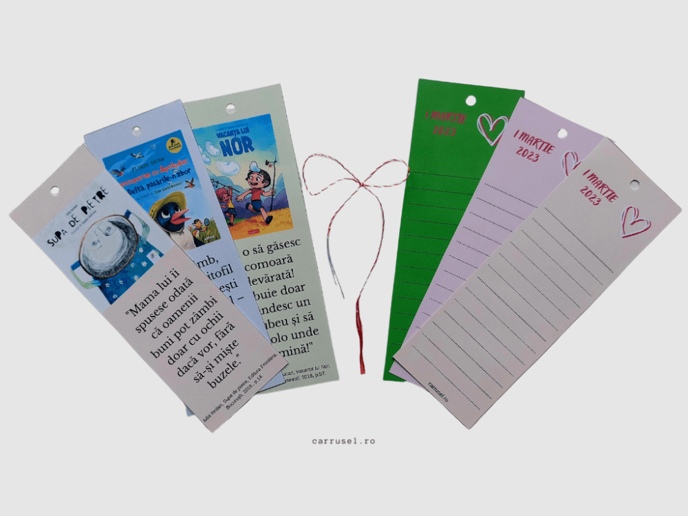 Partea și mai interesantă este că pe spatele fiecărui semn de carte putem adauga propriile noastre cuvinte, motiv pentru care ele seamănă și cu niște mici felicitări. Desigur, nimic nu ne oprește să dăruim și cartea prezentată, dar asta e altă poveste. Până atunci, vorbim despre semnele de carte și eu cred că-i tare frumos ca, atunci când citim o carte, să folosim un astfel de semn, pe care se află și câteva cuvinte de la o persoană dragă. M-am gândit și la copiii mai mici, care nu știu să scrie. Pentru ei am făcut varianta cu spațiu alb, unde pot desena ceva drăguț.