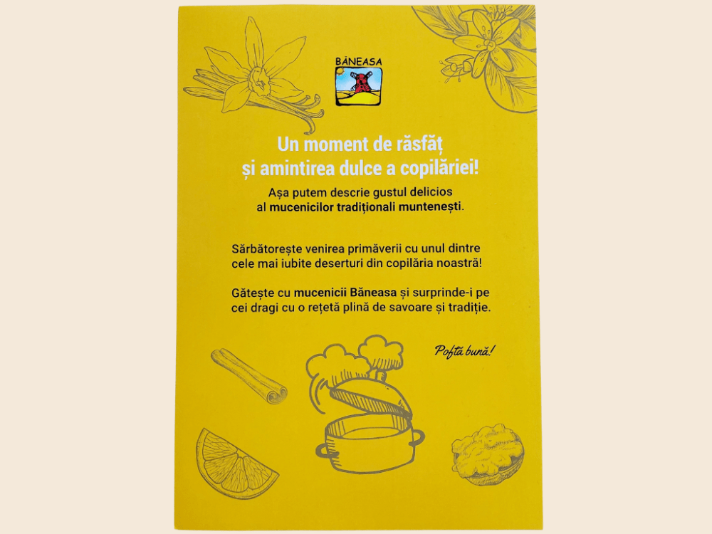 Când vine ziua de 9 martie, bărbatul casei doarme până târziu. Este, probabil, obosit, dar nu putem exclude nici o ușoară stare de deprimare, generată de recent anunțata anulare a Zilei Bărbatul. Ea se trezește și, cu cei doi copii pe lângă ea, scoate din dulap punga cu mucenici. Ce binecuvântare că există astfel de bunatati Băneasa. O doamnă dragă, vecină din cartier, îi povestise că, tare demult, dânsa făcea acest preparat de la zero. Nu se găseau mucenici în magazine și ea își imaginează că trebuie să fi fost tare greu. Sunt foarte mici și, probabil, dura o eternitate să-i faci. E plăcut să gătești, mai ales dacă o faci în familie, dar asta nu ar trebui să îți ocupe tot timpul, iar bunatatile Baneasa ne salvează din astfel de situații. Mucenicii sunt preparați cu cea mai mare atenție și din cea mai bună făină, adusă direct de la Moara Baneasa; sunt fragezi și delicioși, nu se rup la fierbere și cuprind în ei fix gustul ăla la care mamele și bunicile din trecut ajungeau doar după multă trudă.