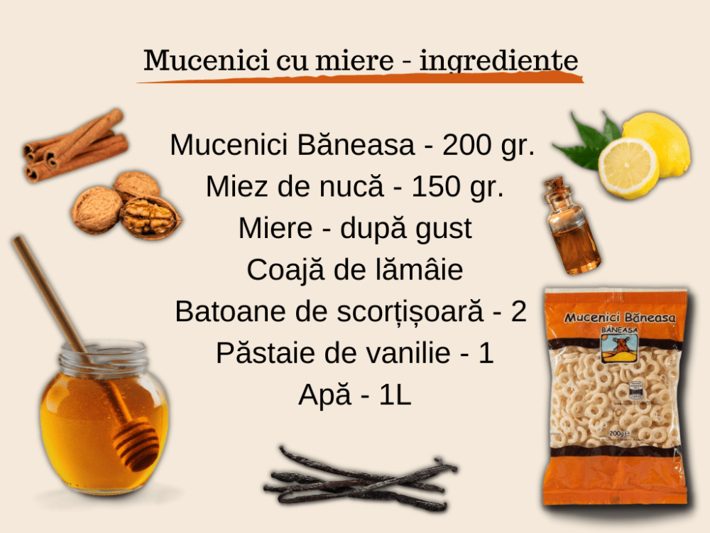 Între timp, mucenicii s-au fiert. Îi ia de pe foc și adaugă în ei arome – esență de rom, coajă de lămâie și scorțișoară. În ultima clipă, decide să pună miere în loc de zahăr*. Tot dulce e, dar dulcele albinelor pare mai sănătos. Ce cantitate? Neapărat după gust. Cei mai buni mucenici sunt cei pe care-i gustăm în timpul preparării. Așa, ei cuprind și o bucățică din noi, alături de raze de bucurie din ochii copiilor.