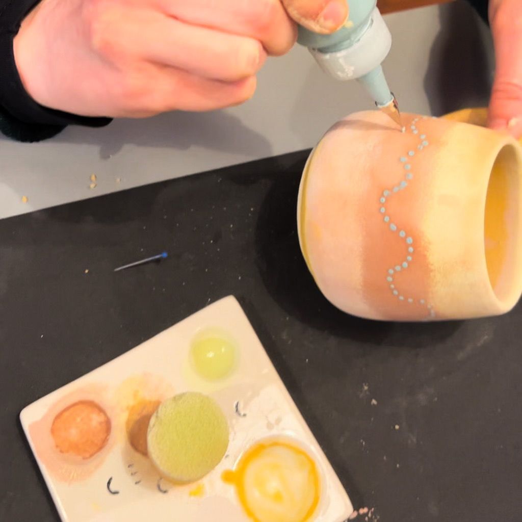 Am fost la Ceramic Cafe și n-aveam cum să nu scriu despre asta. Pentru că mi se pare magic faptul că, în mijlocul unui oraș atât de agitat, există un astfel de loc în care te poți opri și poți picta. Da, ați citit bine. În cazul în care nu știați, vă spun că e o cafenea în care, pe lângă o băutură bună, te poți bucura de o liniște aparte și poți picta. Ce anume? O cană, o farfurie, un castron, un ceainic și multe alte obiecte. Nu are importanță dacă ai sau nu talent. Pictura nu-i doar pentru pictorii profesioniști sau pentru oamenii înzestrați pe acest plan. Nu, pictura e una dintre cele mai faine metode de relaxare, doar că aici e dusă la un alt nivel. Pentru că, după ce trece prin căldura focului, obiectul pictat se transformă într-unul pe care îl poți folosi apoi, în viața de zi cu zi. Eu am ales o cană și-abia aștept să fie gata și să o folosesc. Și am așa o bănuială că va purta în ea liniștea cafenelei, râsul nostru (am râs mult pentru că nu prea ai cum să nu râzi atunci când n-ai talent la desen și totuși desenezi) și întreaga stare de bine din momentele acelea.