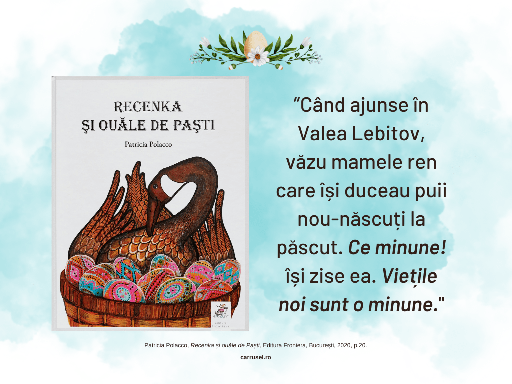 Ne place mult această carte scrisă de Patricia Polacco și apărută la Editura Frontiera. Ne place pentru ca aduce în prim plan lucruri de care avem tendința să uităm sau pe care le luăm de bune. Mi se pare ca e un fel de pledoarie pentru frumos sau o invitație prin care suntem îndemnați să deschidem ochii și să vedem minunile din jurul nostru. În plus, deși nu abordează direct partea religioasă – aceasta fiind, totuși, amintită prin ilustrațiile deosebite – mi se pare că surprinde perfect esența Paștelui. Pentru că Paștele e despre a fi bun, despre a fi împreună cu cei pe care îi iubești, despre a vedea și a sărbători frumosul și despre a nu îți pierde speranța și a crede în minuni.