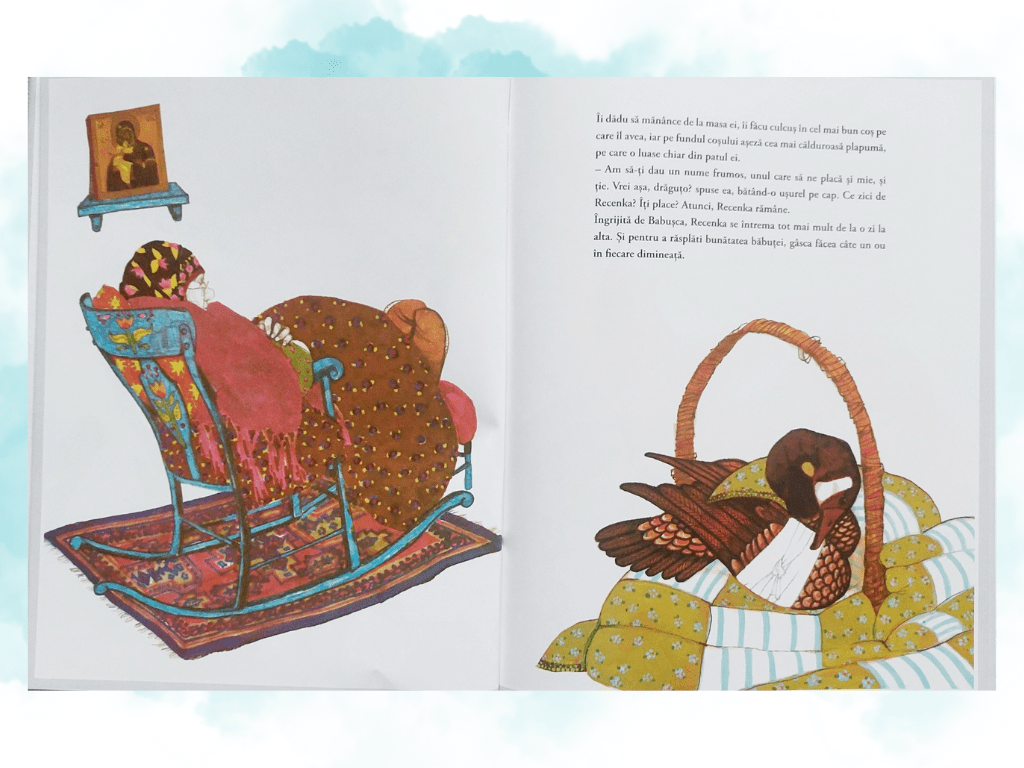 În carte descoperim povestea unei bătrâne din Rusia. Ea se ocupa cu încondeierea ouălor și autoarea ne sugerează discret că e singură și banii proveniți din această activitate sunt o sursă importantă de venit. Asta nu o împiedică să aibă o inimă mare și treaba asta e ilustrată perfect de faptul că bătrâna ajută o gâscă sălbatică rănită. Gâsca, care primește numele Recenka, o răsplătește cu ouă pe care bătrâna le decorează în minunate feluri, dar tot gâsca sparge ouăle. Din greseală. Aici intervine altă minune pe care vă las să o descoperiți singuri în carte, alături de copii (începând cu vârsta de 5 ani). Vă mai spun doar că finalul este surprinzător și, în același timp, atât de normal. Pentru că îi oferă bătrânei fix lucrul de care avea, probabil, cea mai mare nevoie; lucrul de care toți bătrânii au nevoie.