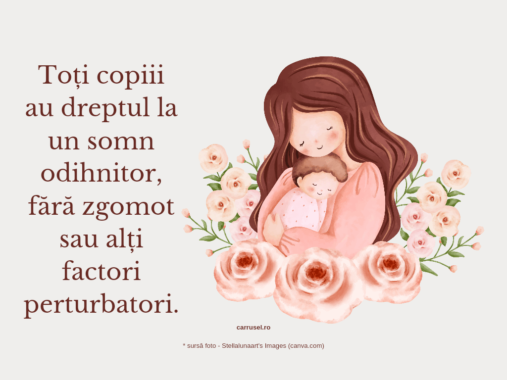 2. Calitatea somnului e foarte importantă pentru toți oamenii și mai ales pentru copii. Copiii cresc atunci când dorm și, atât copiii, cât și adulții, se vindecă în somn atunci cand sunt bolnavi. E important să dormim suficient și să avem parte de un somn de calitate foarte bună. Chiar dacă avem un bebeluș care nu e foarte sensibil la stimulii din jur și care poate dormi în orice condiții, e important să ne asigurăm că el are parte de un somn odihnitor. Somnul în zgomot, lumină artificială sau poziții incomode nu e un somn bun din punct de vedere calitativ; Bebelușii au dreptul și au nevoie să doarmă într-un loc confortabil, pe întuneric și în liniște. Dacă noi, mamele, respectăm acest lucru, vom avea, la rândul nostru, parte de un somn odihnitor.