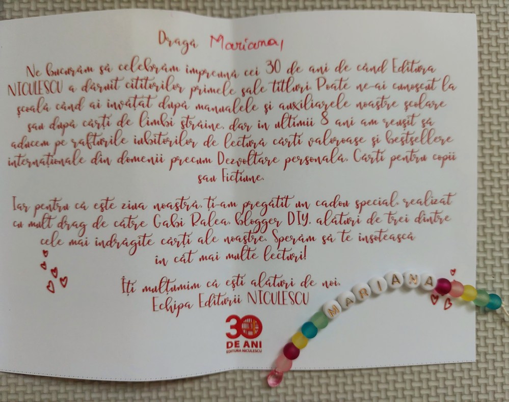 Amenajarea camerei copiilor a venit la pachet cu multe emoții, poate prea multe. Am început cu teamă și-am trecut rapid la entuziasm, atunci când am văzut că visul nostru chiar începe să se materializeze. Doar că apoi a intervenit oboseala, iar vineri, deși știam că mai e doar puțin și vom termina, mă mișcam ca melcul, eram irascibilă și n-aveam poftă de nimic. Copiii și soțul meu erau, desigur, din aceeași poveste. Așa se face că, atunci când am primit un mesaj de la curier, mi-am zis că sigur e vorba despre ceva de care am uitat sau, în cel mai rău caz, am făcut vreo gafă. Pentru că, oricât mă gândeam, nu-mi aminteam de vreo comandă făcută de mine, dar cum am făcut tare multe în zilele astea, nici nu puteam să fiu sigură. Mare mi-a fost mirarea atunci când am constatat că nu era vorba despre o comandă, ci despre un cadou neașteptat. Editura NICULESCU a împlinit 30 de ani și, cu această ocazie, a făcut cadouri, dar să nu vă imaginați că au fost cadouri obișnuite, căci pe lângă cele trei comori de descoperit prin citit, am primit și un semn de carte personalizat. Da, un semn de carte cu numele meu, cadou care a avut un impact uriaș asupra mea, ca și când aș fi primit, dintr-o dată o doza suplimentară de energie. Cum așa? Pentru că mi-a amintit de mine, deoarece toată povestea asta nu a fost niciodată doar despre copii. Da, oficial, pentru ei e un nou început. Vor dormi singuri și va avea fiecare spațiul lui, pe care va decide când, cum și dacă îl va împărți cu alți membri ai familiei. Doar că asta nu se va întâmpla doar pentru ei. Amenajarea camerei lor a determinat schimbări în toată casă. Fără să exagerez, aș putea spune că, până acum, fiecare dintre încăperile locuinței noastre era comună și, mai ales, a copiilor. Eu îmi făceam loc cum puteam printre ei, respectând, în primul rând, nevoile lor. Acum, însă, pentru prima dată de când sunt mamă, voi avea un spațiu doar al meu. E greu să exprim în cuvinte ce minune e asta pentru o mamă introvertită și cu o mare nevoie de spațiu personal. Cumva, simt că respir din nou, iar semnul acesta de carte mi-a reamintit de mine și de ce voi primi la final. În acest fel, energia mi-a revenit, m-am pus pe treabă cu forțe noi și așa se face că diseară copiii mei vor dormi fiecare în patul lui. Mai avem mici detalii, desigur, ne vor consuma și acestea timp, dar greul a trecut. Prin urmare, le mulțumesc din suflet Editurii NICULESCU și lui Gabi Ralea, blogger DIY, pentru minunatul cadou, primit fix când aveam cea mai mare nevoie de el.