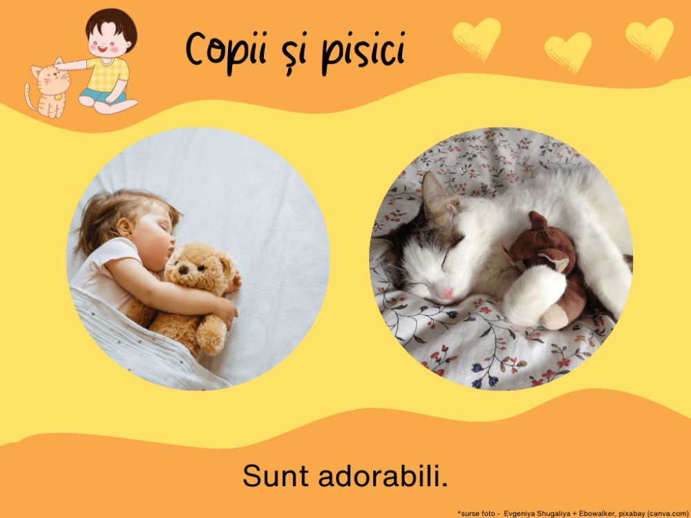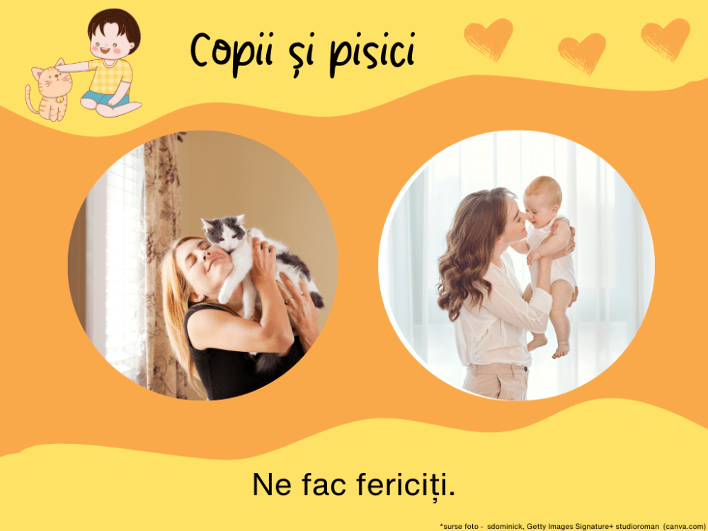 Așa cum sugeram mai sus, lucrurile pe care le voi scrie nu-s doar niște simple idei, inspirația pentru ele venind de la personaje reale. Pentru că, da, eu chiar am o prietenă care are pisică și încă una tare frumoasă, cu blana roșcat-aurie și cu o personalitate foarte puternică. Numele ei e Goldie și e personaj principal în povestea mea, alături de copiii mei, Tudor și Maria. Și, da, nu o dată s-a întâmplat ca în discuțiile cu prietena mea să rostim, una sau alta, fraze de genul „și al meu/ a mea face la fel”, pentru a conștientiza apoi că vorbim despre pisică și copii și-a ne distra copios de fiecare dată când constatam cât de tare seamănă. Așadar, vă povestesc și vouă câteva dintre concluziile la care am ajuns în urma acestor discuții.
