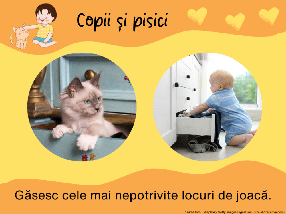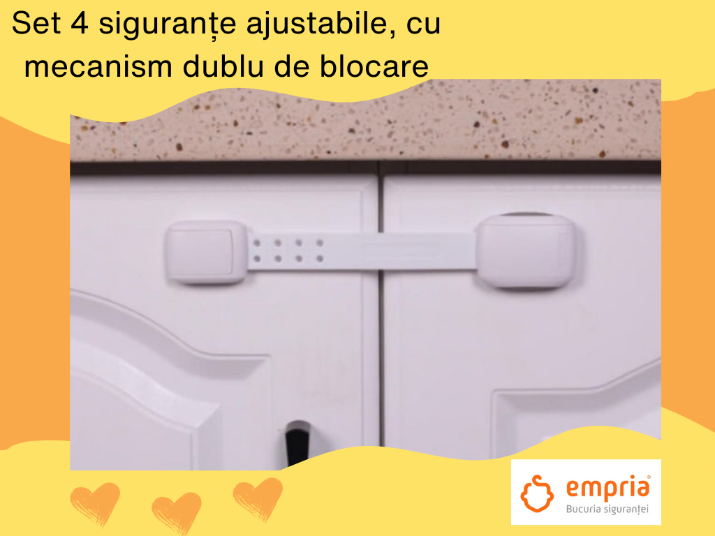 Cum spuneam mai sus, copiii și animăluțele sunt foarte inventivi și, deopotrivă, curioși. Vor să cunoască în detaliu fiecare colțișor al casei, chiar și cele despre care noi nici nu eram conștienti că există și, în special, pe cele interzise. Apoi, au dorința asta de a-și face culcuș în spații cât mai mici, atât de mici încât, în primă fază, nici nu te-ai fi gândit că vor avea loc acolo. E amuzant când fac asta, dar poate fi și periculos, atunci când, de exemplu, în dulap se găsesc detergenți sau medicamente. Apoi, poate unii dintre noi apreciem și un dulap în care hainele sunt cât de cât aranjate și, mai ales, nu sunt pline de salivă și nu au găuri sau fire trase de gheruțele de pisică. Plus că sertarele sau ușile pot prinde ușor degețele mici ori lăbuțe și, atât pisica, cât și copilul pot rămâne blocați în ele. Mă rog, așa cum le-au deschis pe dinafară, ar putea să le deschidă și pe dinăuntru, dar e mai greu când ești mic și singur și s-a făcut deodată întuneric. Poți doar să miauni sau să plângi și, până ești găsit, ai tras deja o sperietură grozavă. Așa că mai bine folosim siguranțe pentru setare. E mai sigur pentru toată lumea și ne scapă de multă bătaie de cap.