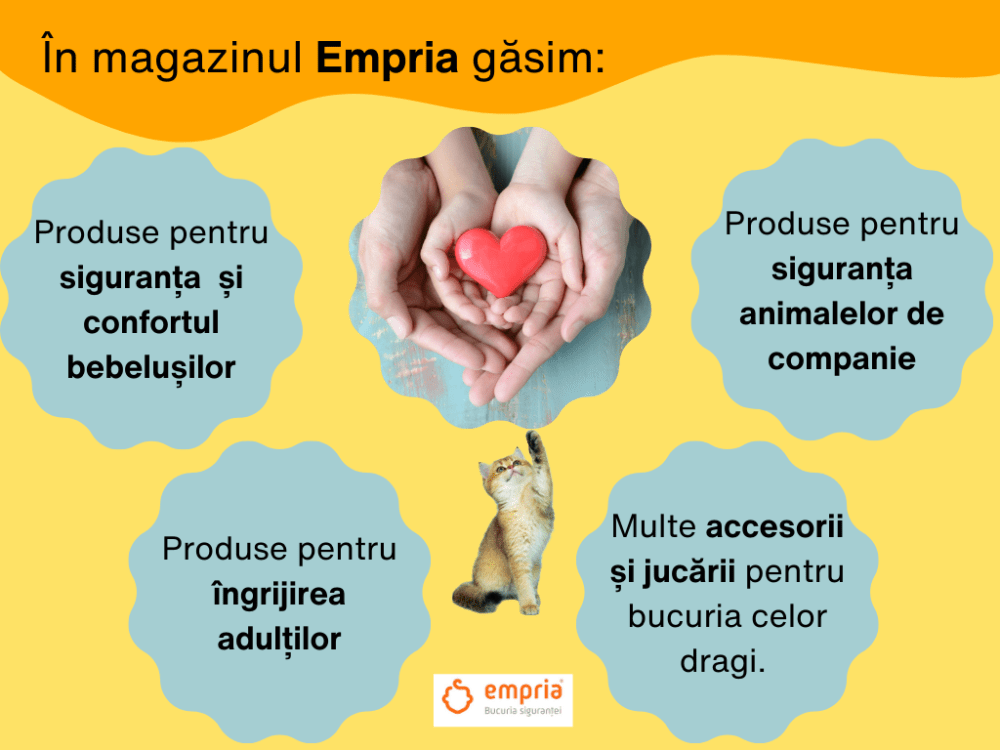 Toate ființele iubite au în comun și grija pe care le-o purtăm pentru că, da, iubirea vine la pachet cu grijă. Aceasta din urmă e utilă, dar atunci când e prea multă ori când e doar grijă, poate să ne sufoce. Așa că-i bine să găsim soluții pentru probleme, să respirăm ușurați și să ne bucurăm din plin de și cu cei pe care-i iubim. Cum anume? Cu ajutorul Empria, desigur, locul care, cu iubire, grijă și respect, a reușit să cuprindă toate acele produse esențiale pentru siguranța celor dragi, de la bebeluși și copii până la adulți și animale de companie. Apoi, oamenii de la Empria nu doar le-au strâns pe toate la un loc, au reușit și să demonstreze că sunt foarte serioși în ceea ce fac, o dovadă fiind faptul că au câștigat de mai multe ori titlul de cel mai bun magazin online. În plus, mărturie stau și recenziile clienților mulțumiți, pe care le găsim pe site, dar și propria noastră interacțiune cu ei, pentru că, da, vorbim despre un site care oferă consultanță și asta după, ce, în prealabil, ne-a pus la dispoziție descrieri foarte detaliate ale produselor, alături de un ghid gratuit pentru protecția copilului în casă. Nu în ultimul rând, la toate acestea se adaugă transportul rapid, în locker sau acasă, gratuit pentru comenzi de cel puțin 199 lei.