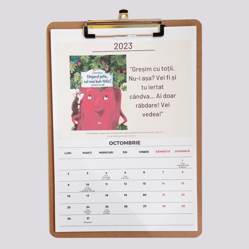 În octombrie deja stăm mai mult în casă, în pături pufoase și călduroase, motiv pentru care am ales o carte cu mai multe povești, numai bune de citit în pat, cu puii lângă noi. Așadar, în octombrie, Calendarul Micului Cititor aduce în prim-plan cartea „Stejarul pitic, cel mai bun tătic!”, scrisă de Victoria Pătrașcu și ilustrată de Livia Coloji.