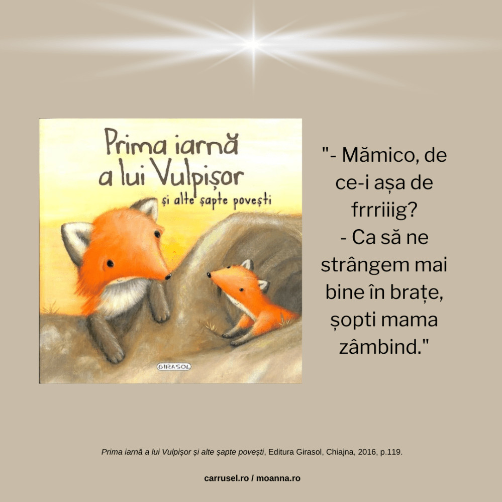 Magia asta mi se întâmplă mie de fiecare dată când redescopăr cărțile cu Vulpișor – Prima iarnă a lui Vulpisor și alte șapte povești și Prima vară a lui Vulpișor si alte șapte povești. Ele cuprind povești frumoase, scurte și simple, dar ceea ce le face cu adevărat deosebite pentru noi e faptul că, atunci când le deschidem, tot ele încep să spună și alte povești. Unele pe care le auzi doar cu sufletul și care, în cazul nostru, sunt despre un Tudor mic și o Maria și mai mică, despre ochișori strălucitori și plini de uimire și despre miros care seamănă mai degrabă cu cel de bebeluși decât cu cel de copii mari, cum se pare că sunt ei acum. Da, am citit de multe ori poveștile din aceste cărți și chiar dacă, în timp, poate voi uita detalii din ele, știu că nu voi uita bucuria trăită alături de copiii mei și sunt destul de sigură că nici ei nu o vor uita. Îmi dau seama de asta atunci când observ cum li se luminează fețele de fiecare dată când revăd aceste cărți. Deci, da, azi e despre amintiri frumoase și despre cum îmbrățișările sunt și mai călduroase iarnă.