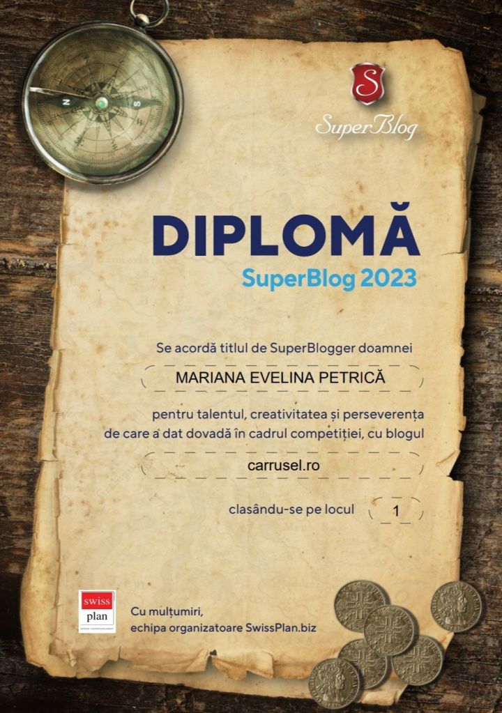 Acum, în 2023, toamna, când am obținut locul 1, a fost pentru mine cea mai provocatoare ediție. Mi-am dorit trofeul, dar nu mi-am propus să-l câștig, ba chiar, datorită unor factori obiectivi, am vrut să mă opresc la un moment dat. Am continuat atunci când am realizat că aceasta e o oportunitate pentru a învăța să scriu și în condiții mai ”vitrege”, când cuvintele nu curg natural în mintea mea. Am reușit și sunt mândră de mine și recunoscătoare tuturor celor care fac posibil acest concurs, deși, probabil, ”concurs” e un termen prea impresonal pentru a descrie ce se întâmplă aici. Eu aș spune că SuperBlog e ca o mare familie în care sunt primiți, cu brațele deschise, toți cei care își doresc să crească frumos pe acest plan, fie ei concurenți sau sponsori.