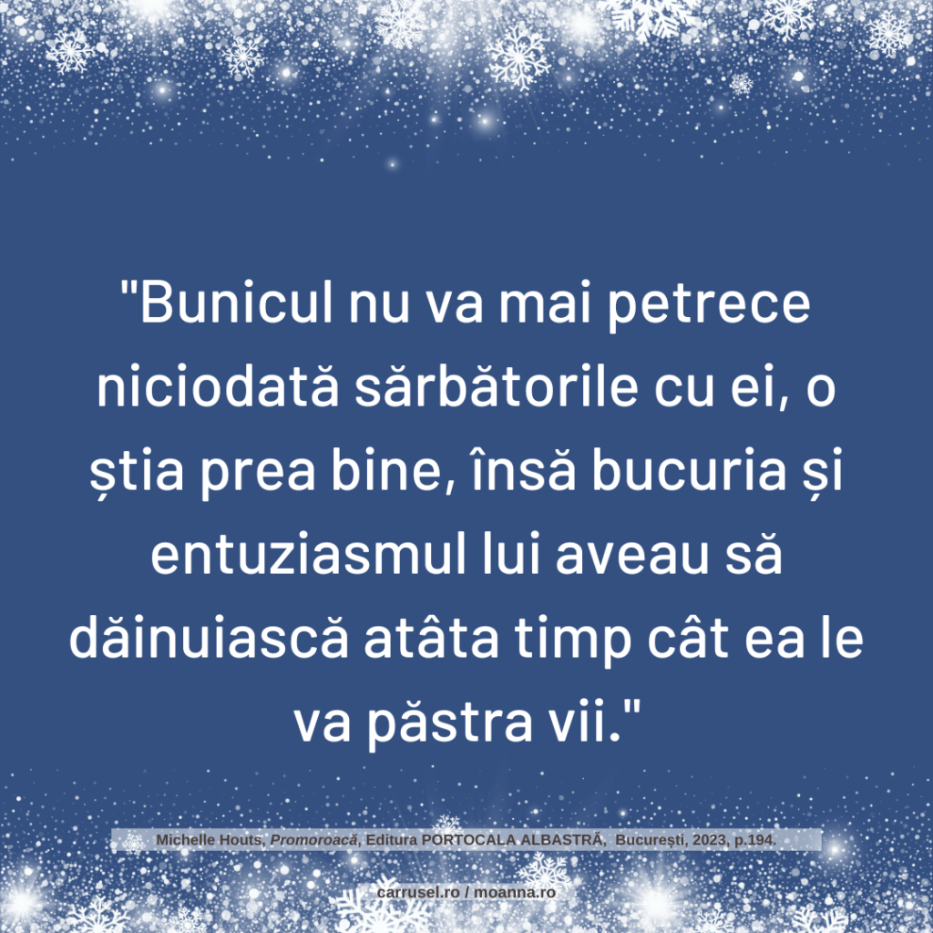 Ei bine, cam așa m-am simțit eu atunci când am citit Promoroacă împreună cu copiii. Încă de la primele pagini, am simțit că am regăsit ceva pierdut, ceva care îmi lipsea, dar de a cărui lipsă am devenit conștientă abia atunci; ceva care m-a făcut să zâmbesc instant și care, spre și mai marea mea bucurie, le-a captat imediat atenția copiilor. Pentru că, da, sunt tot felul de cărți pe lume. Sunt acelea la care copiii mă întrerup într-una, nu pentru că nu ar fi interesante, ci pentru că ei au o mulțime de întrebări și le e teamă că le-ar uita dacă așteptă, și sunt acelea pe care ei le ascultă în liniște deplină, pe nerăsuflate. Toate sunt prețioase, dar ultimele au ceva aparte, greu de transpus în cuvinte. Promoroacă, o carte scrisă de Michelle Houts și apărută la Editura PORTOCALA ALBASTRĂ e una dintre ele și, dacă ar fi să aleg un singur cuvânt pentru a o descrie, aș spune că e pur și simplu frumoasă. O frumusețe pură, care se pliază perfect pe sufletul copiilor. Pentru că această carte are darul acela de a te face să visezi și de a te transpune într-o lume magică, unde totul e surprinzător de frumos. Chiar și când e greu.