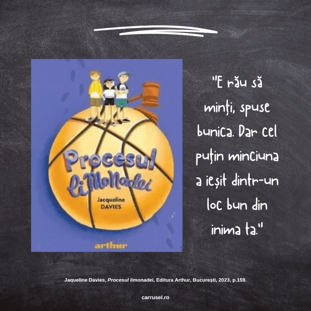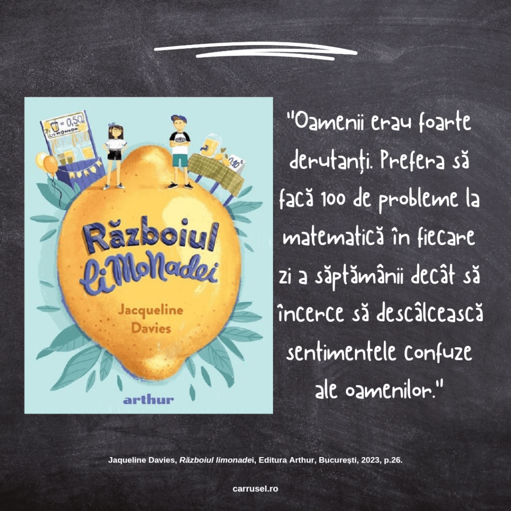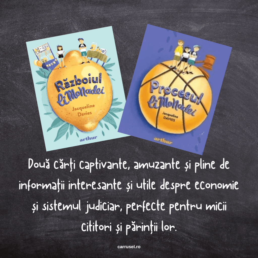 Războiul Limonadei și Procesul Limonadei sunt două cărți pe care le aveam de ceva timp în bibliotecă, iar ele își așteptau cuminți rândul la citit. În ceea ce mă privește, am ezitat, recunosc, din motive superficiale. Citisem despre Procesul Limonadei că i-ar ajuta pe copii să înțeleagă sistemul judiciar (american) și îmi era teamă că ar putea fi prea teoretică. Însă în condițiile în care, așa cum spuneam în articolul trecut, de ceva timp mi s-a interzis cititul (da, se poate întâmpla și așa ceva) m-a atras faptul că aceste cărți au capitole scurte și-am zis să le încercăm. Căci, da, eu încă le citesc cu voce tare copiilor și m-am hotărât ca hernia de disc să nu fie cea care mă va forța să întrerupt acest obicei frumos. Prin urmare, am început să citim, prima carte din serie fiind Războiul Limonadei. Emoțiile mi s-au risipit rapid, deoarece povestea ne-a prins încă de la primele rânduri, atât pe copii, cât și pe mine.