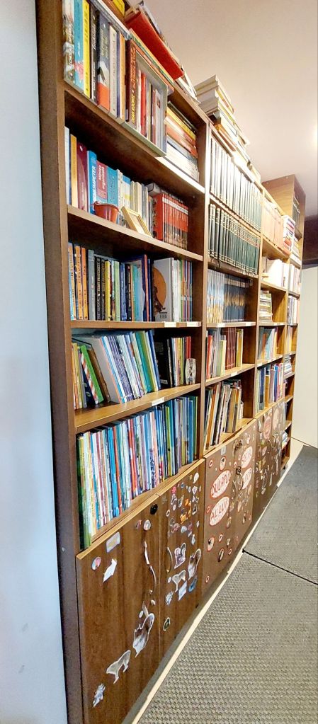 În ceea ce privește motivele pentru care scriu acest articol, o fac deoarece blogul meu funcționează uneori și ca un album cu amintiri și nu vreau să uit momentul ăsta. Bine, de uitat complet n-am cum să-l uit, dar vreau să mi-l amintesc în detaliu și știu că propriile mele cuvinte, recitite peste ani, vor funcționa ca o punte spre trecut. Așa se face că, după ce deja debarasasem parțial partea de sus a bibliotecii vechi, unde cărțile erau stivuite până în tavan, am realizat că trebuie să-i fac o poză – sau mai multe – pentru un viitor articol. Și astfel a apărut ceea ce vedeți și citiți aici – un articol care ar putea părea o simplă înșiruire a unor evenimente, dar care, de fapt, e despre vechi și nou, despre dorințe sau visuri care prind viață în mod neașteptat, despre copii care se nasc și ne umplu casele cu bucurie, despre copii care cresc sub ochii noștri și noi ne dăm seama abia când asta deja s-a întâmplat, despre dezvoltare, despre iubire, despre munca în echipă și despre entuziasm, despre trecerea timpului, dar și despre acceptare și împăcare. Desigur, e și un articol despre sute de alte povești și lumi, cuprinse în paginile unor cărți care acum și-au găsit o nouă casă.