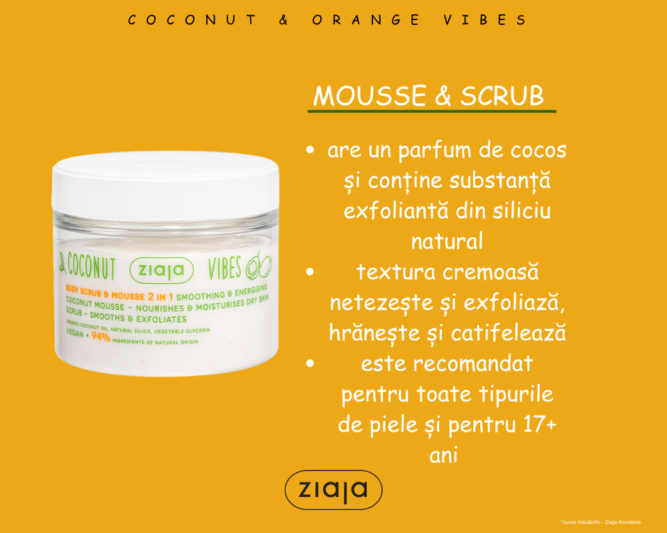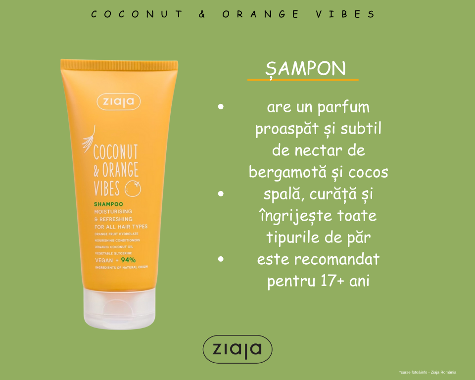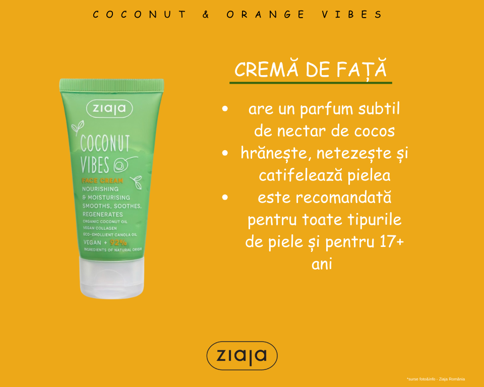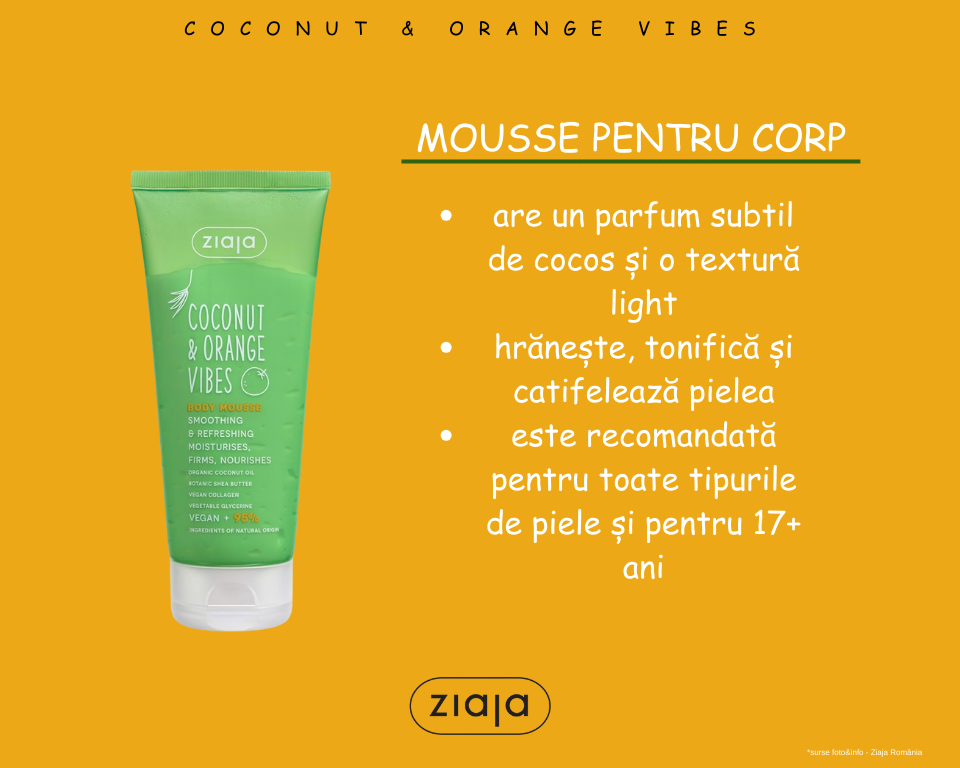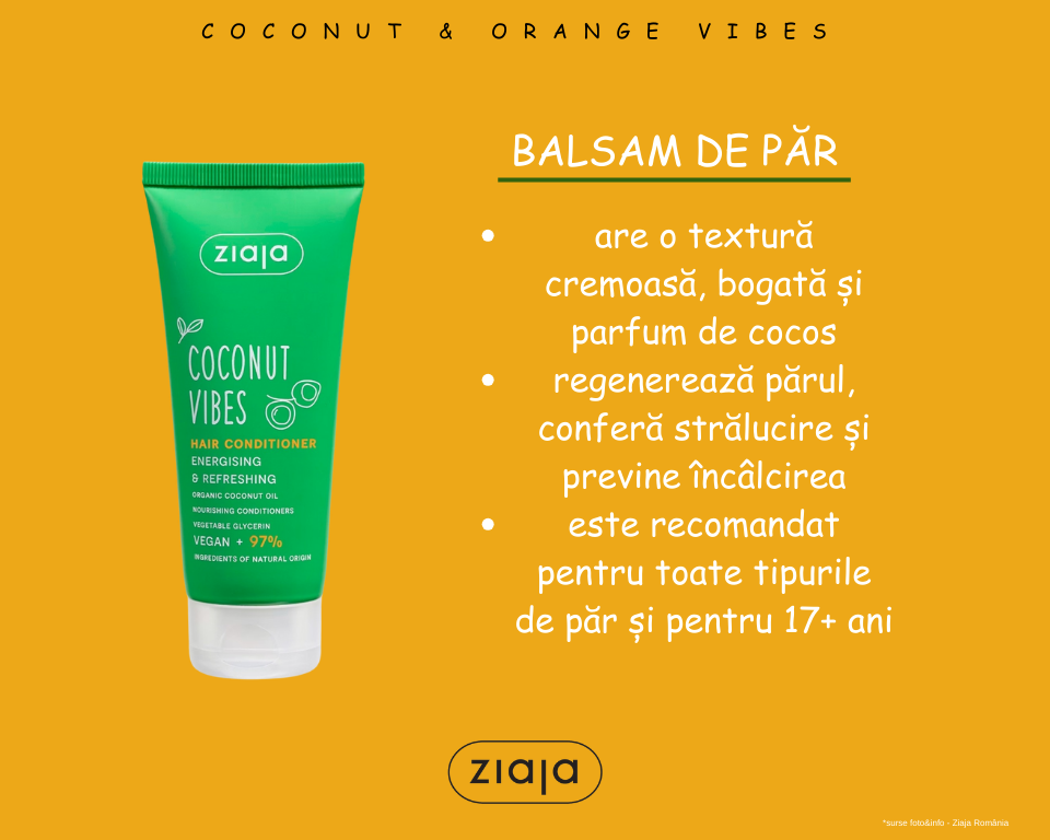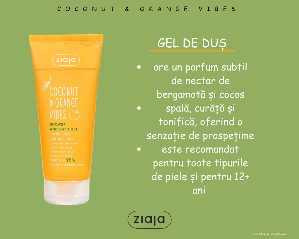 Cu Ziaja România m-am întâlnit prima dată în urmă cu câțiva ani. Pentru că produsele Ziaja sunt unele prietenoase cu pielea, iar eu, grație copiilor mei, sunt client fidel BebeTei și Farmacia Tei, am avut oportunitatea de a le descoperi aici. Mult timp cumpărăturile de felul acesta erau unica mea pauză de la copii și de fiecare dată când când mergeam la cumpărături, îmi luam și mie ceva drăguț. Produsele Ziaja mi-au plăcut pentru că aveau și au un preț accesibil, și, mai ales, erau și sunt blânde cu pielea. Asta contează mult, eu am o piele foarte sensibilă, mă irit instant dacă folosesc un produs care nu-i ok. Astfel că nu-i cred pe cuvânt pe cei de la Ziaja România atunci când spun că au produse cu peste 90% ingrediente naturale, doar îmi ascult pielea și, pentru că ea mi-a dat undă verde, vă invit să urmăriți o scurtă prezentare a gamei Coconut Orange Vibes de la Ziaja România. Mie, așa cum ați intuit deja, mi-a plăcut cel mai mult gelul de duș Coconut & Orange Vibes, cu parfum subtil de nectar de bergamotă și cocos, care a adăugat o nouă aromă faină și revigorantă în baia mea. S-a potrivit perfect pentru că, așa cum spuneam, în timp am perfecționat metoda de mai sus și de aceea mă asigur că am mereu mai multe tipuri de gel de duș la dispoziție. Am observat că, dacă folosesc aceleași arome, intervin rutina și obișnuința și ritualul nu mai e așa eficient. În plus, acum am avut parte chiar și de mai multă diversificare, deoarece în gama Coconut & Orange Vibes există și un mousse & scrub cu granule fine pentru corp. Pe lângă mirosul de cocos, care se întâmplă să-mi fie tare drag, mi-au plăcut în mod special acele granule fine, mereu am preferat un scrub mai blând în detrimentul unui cu granule mari. Altfel, e bine de știut că în gama de produse Ziaja România găsim și cremă de față sau de corp, loțiune tonică, șampon și balsam pentru păr și chiar și balsam pentru buze. Și, da, toate conțin până la 98% ingrediente vegetale și nu sunt testate pe animale.